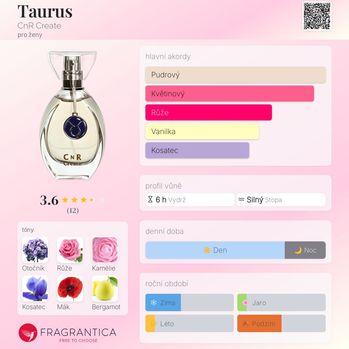 Taurus podle CnR Create je Floral vůně pro ženy. Taurus byl/a uveden/a v roce 2008. "Nosem" za touto vůní je Olivier Funel. Vrchní tóny jsou Kamélie, Červený mák a Bergamot; střední tóny jsouOtočník, Růže, Narcis a Zázvor ; základní tóny jsou Kosatec a Pižmo.