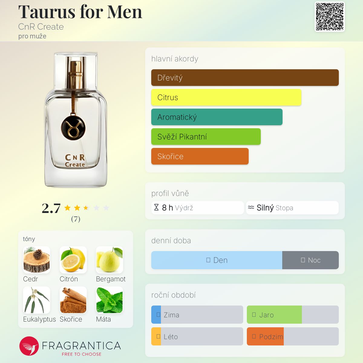 Taurus for Men podle CnR Create je Aromatic Fougere vůně pro muže. Taurus for Men byl/a uveden/a v roce 2010. "Nosem" za touto vůní je Olivier Funel. Vrchní tóny jsou Virginský cedr, Citron amalfi , Bergamot a Máta; střední tóny jsouEukalyptus, Cypřiš a Koriandr ; základní tóny jsou Skořice, Opoponax a Oregano.