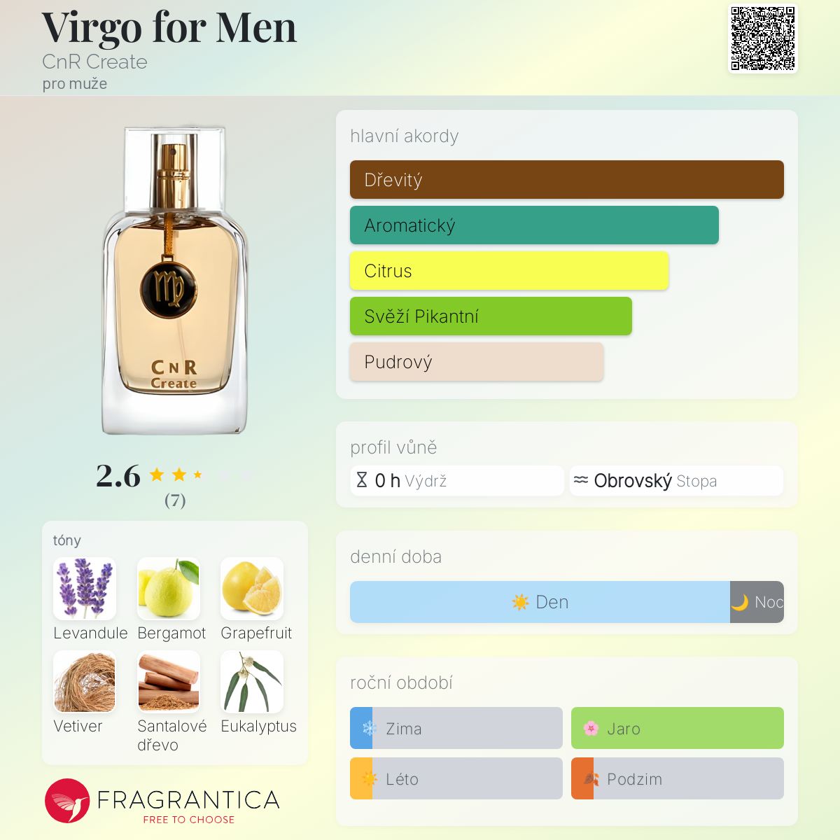 Virgo for Men podle CnR Create je Woody Aromatic vůně pro muže. Virgo for Men byl/a uveden/a v roce 2010. "Nosem" za touto vůní je Olivier Funel. Vrchní tóny jsou Levandule, Bergamot a Grapefruit; střední tóny jsouVetiver, Santalové dřevo a Eukalyptus ; základní tóny jsou Pižmo, Kadidlo a Cypřiš.