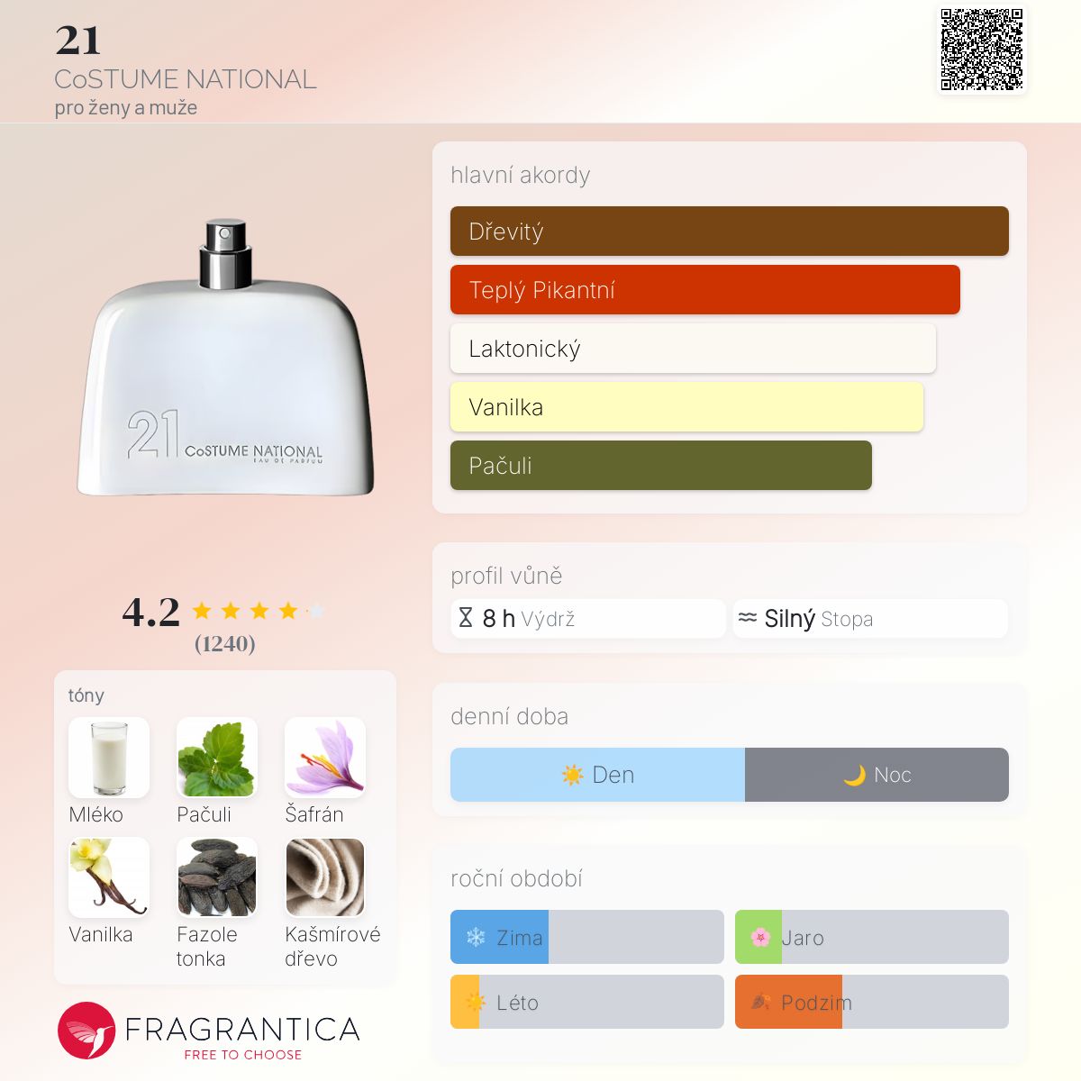 21 podle CoSTUME NATIONAL je Orientální Woody vůně pro ženy a muže. 21 byl/a uveden/a v roce 2007. 21 byl/a vytvořen/a IFF a Juliette Karagueuzoglou. Vrchní tóny jsou Mléko, Šafrán, Kašmírové dřevo a Pomerančový květ; střední tóny jsouPižmo, Med, Římský kmín, Černý pepř, Olibanum a Šalvěj ; základní tóny jsou Pačuli, Vanilka, Fazole tonka, Pižmo, Cedr, Vetiver, Labdanum, Jantarové dřevo, Kašmír a Agarové dřevo (oud).