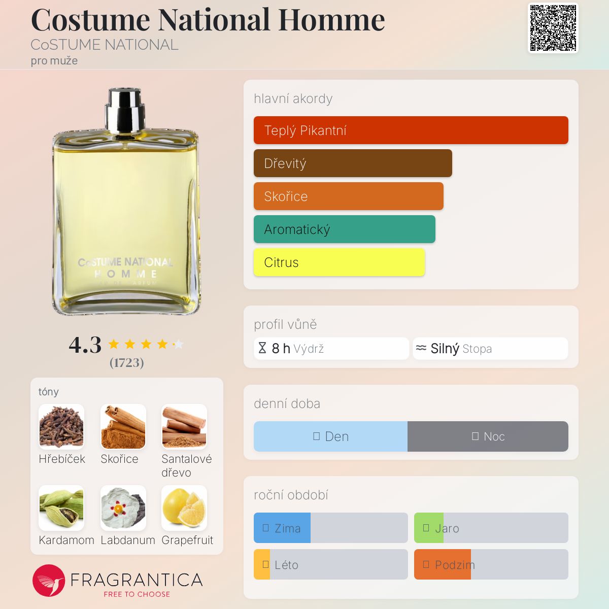 Costume National Homme podle CoSTUME NATIONAL je Woody Spicy vůně pro muže. Costume National Homme byl/a uveden/a v roce 2009. "Nosem" za touto vůní je Dominique Ropion. Vrchní tóny jsou Kardamom, Grapefruit a Bergamot; střední tóny jsouHřebíček, Skořice a Tymián ; základní tóny jsou Santalové dřevo, Labdanum a Pačuli.