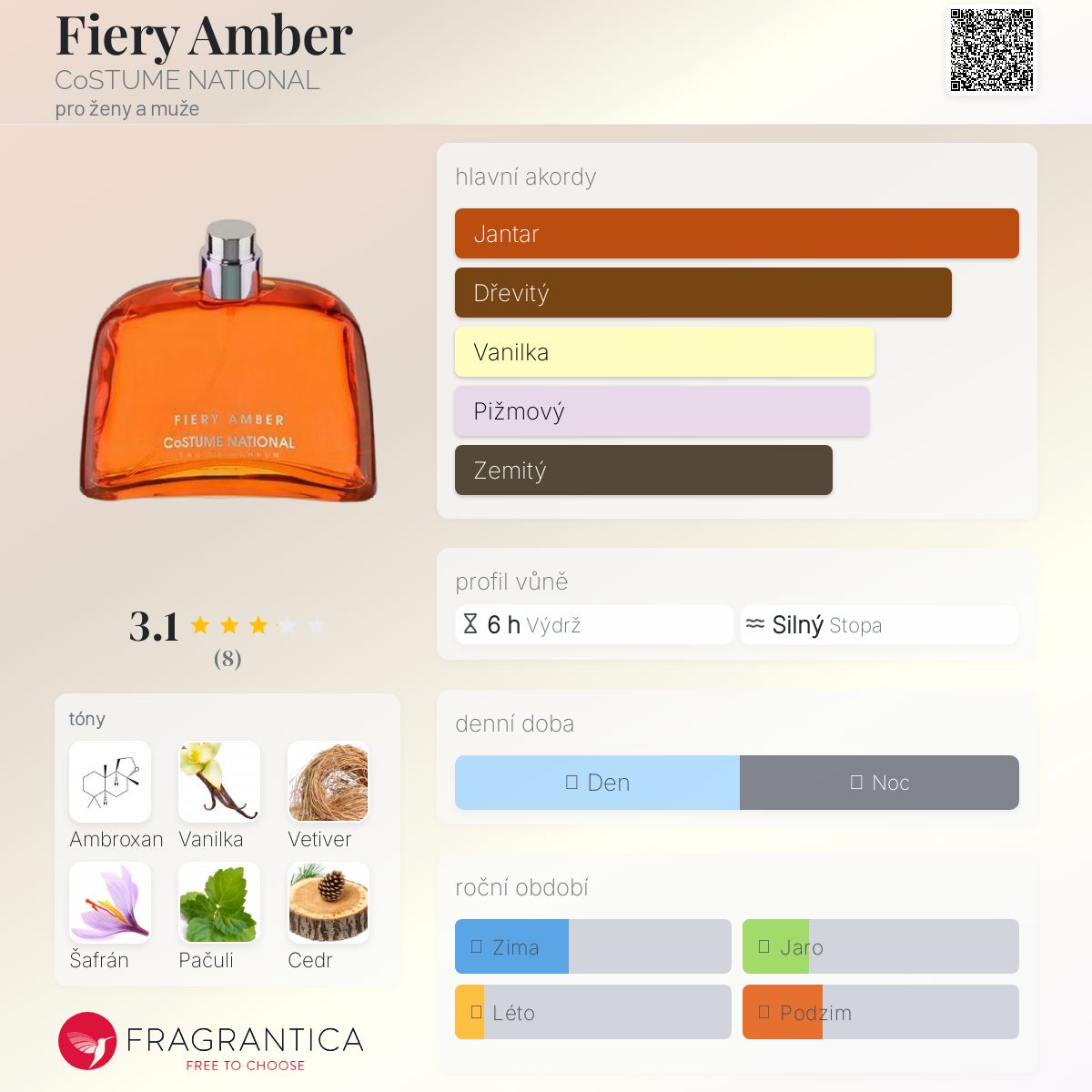 Fiery Amber podle CoSTUME NATIONAL je Orientální Woody vůně pro ženy a muže. Toto je nová vůně. Fiery Amber byl/a uveden/a v roce 2025. Vrchní tón je Šafrán ; střední tóny jsouVanilka, Pačuli a Cedr ; základní tóny jsou Ambroxan, Haitský vetiver a Labdanum.