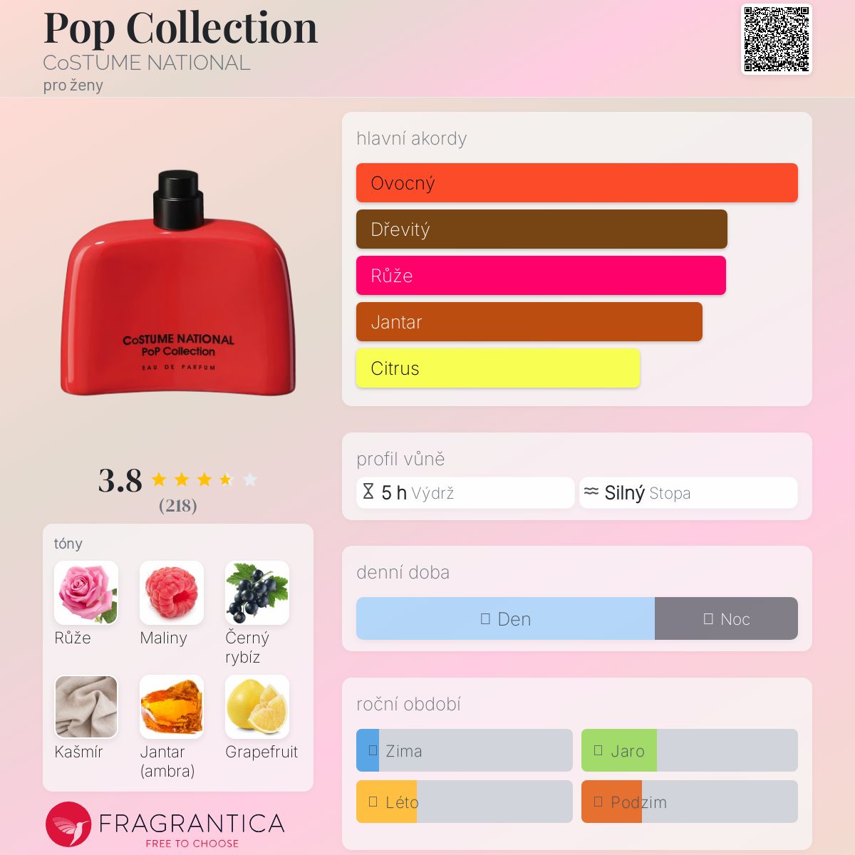 Pop Collection podle CoSTUME NATIONAL je Orientální Floral vůně pro ženy. Pop Collection byl/a uveden/a v roce 2011. "Nosem" za touto vůní je Dominique Ropion. Vrchní tóny jsou Maliny, Černý rybíz a Grapefruit; střední tóny jsouRůže a Jasmín ; základní tóny jsou Kašmír, Jantar (ambra) a Pačuli.