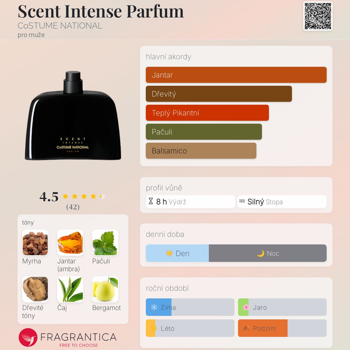 Scent Intense Parfum podle CoSTUME NATIONAL je Orientální Woody vůně pro muže. Vrchní tóny jsou Zelený čaj a Bergamot; střední tóny jsouJasmín a Ibišek ; základní tóny jsou Myrha, Jantar (ambra), Pačuli a Dřevité tóny.