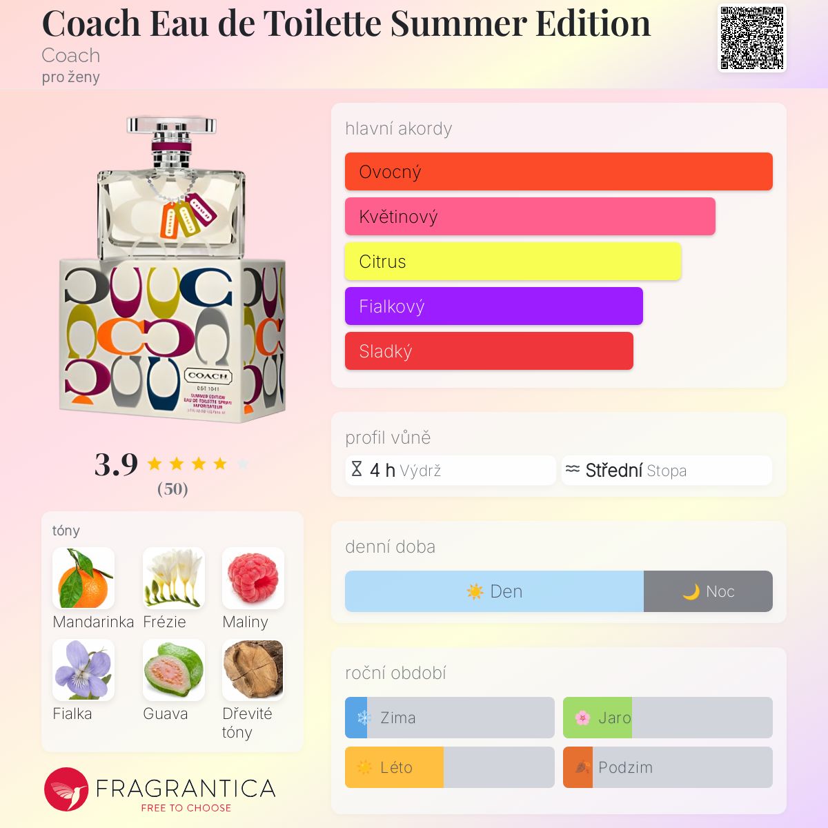 Coach Eau de Toilette Summer Edition podle Coach je Floral Fruity vůně pro ženy. Coach Eau de Toilette Summer Edition byl/a uveden/a v roce 2011. Vrchní tóny jsou Mandarinka, Maliny a Guava; střední tóny jsouFrézie, Fialka a Měsíček ; základní tóny jsou Dřevité tóny a Jantar (ambra).