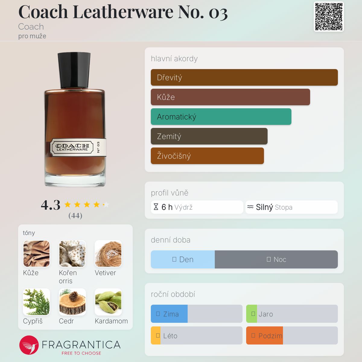 Coach Leatherware No. 03 podle Coach je Leather vůně pro muže. Coach Leatherware No. 03 byl/a uveden/a v roce 2013. Vrchní tóny jsou Cypřiš, Kardamom, Citrón a Růžový pepř; střední tóny jsouKůže, Orris a Cedr ; základní tóny jsou Vetiver, Papyrus a Pačuli.