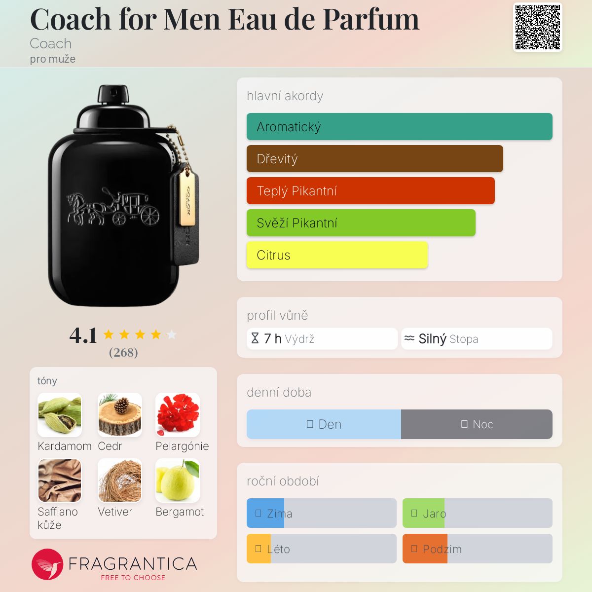 Coach for Men Eau de Parfum podle Coach je Orientální Fougere vůně pro muže. Toto je nová vůně. Coach for Men Eau de Parfum byl/a uveden/a v roce 2025. "Nosem" za touto vůní je Juliette Karagueuzoglou. Vrchní tóny jsou Kardamom a Bergamot; střední tóny jsouCedr a Pelargónie ; základní tóny jsou Saffiano kůže a Vetiver.