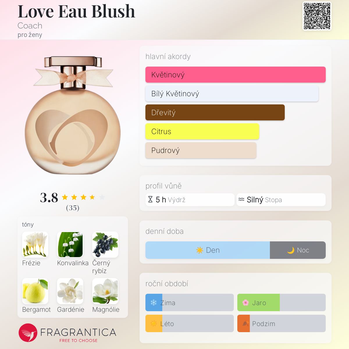 Love Eau Blush podle Coach je Floral Woody Musk vůně pro ženy. Love Eau Blush byl/a uveden/a v roce 2014. Vrchní tóny jsou Frézie, Černý rybíz a Bergamot; střední tóny jsouKonvalinka, Gardénie, Magnólie a Jasmín ; základní tóny jsou Pižmo, Cedr, Santalové dřevo a Jantar (ambra).