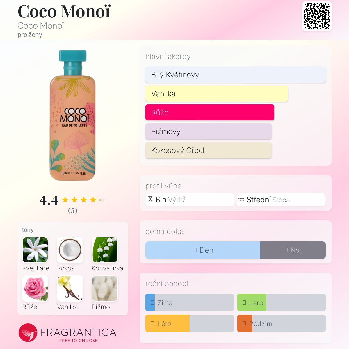 Coco Monoï podle Coco Monoï je Floral Fruity Gourmand vůně pro ženy. Coco Monoï byla spuštěna během 2020. Vrchní tóny jsou Květ tiare a Kokos; střední tóny jsouKonvalinka a Růže ; základní tóny jsou Vanilka a Pižmo.