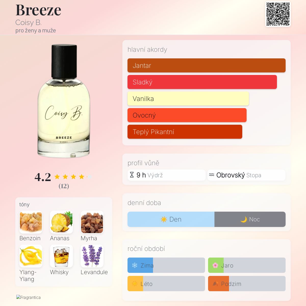 Breeze podle Coisy B. je Orientální Floral vůně pro ženy a muže. Breeze byl/a uveden/a v roce 2024. "Nosem" za touto vůní je Mohamed Mandouh. Vrchní tóny jsou Ananas, Levandule, Bergamot a Liči; střední tóny jsouMyrha, Ylang-Ylang, Pivoňka a Jasmín ; základní tóny jsou Benzoin, Whisky, Mandle, Vanilka, Pižmo, Fazole tonka a Ambra.