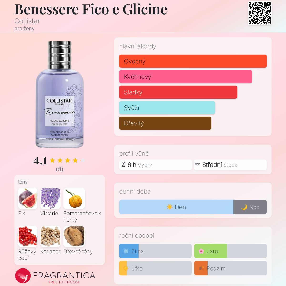Benessere Fico e Glicine podle Collistar je Floral Fruity vůně pro ženy. Toto je nová vůně. Benessere Fico e Glicine byl/a uveden/a v roce 2024. Vrchní tóny jsou Pomerančovník hořký a Růžový pepř; střední tóny jsouFík, Vistárie a Koriandr ; základní tón je Dřevité tóny.
