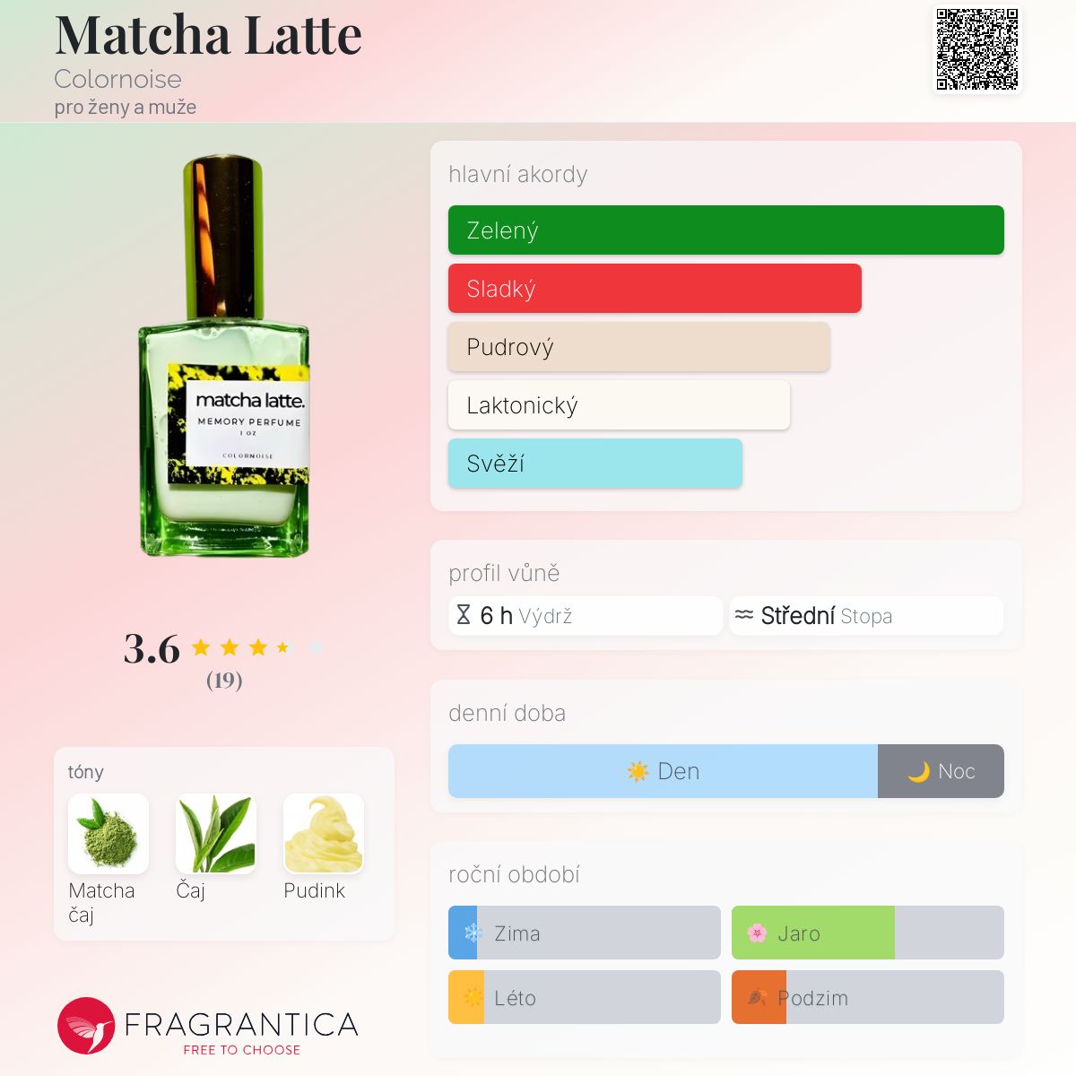 Matcha Latte podle Colornoise je Aromatic vůně pro ženy a muže. Matcha Latte byl/a uveden/a v roce 2019. "Nosem" za touto vůní je Krista.