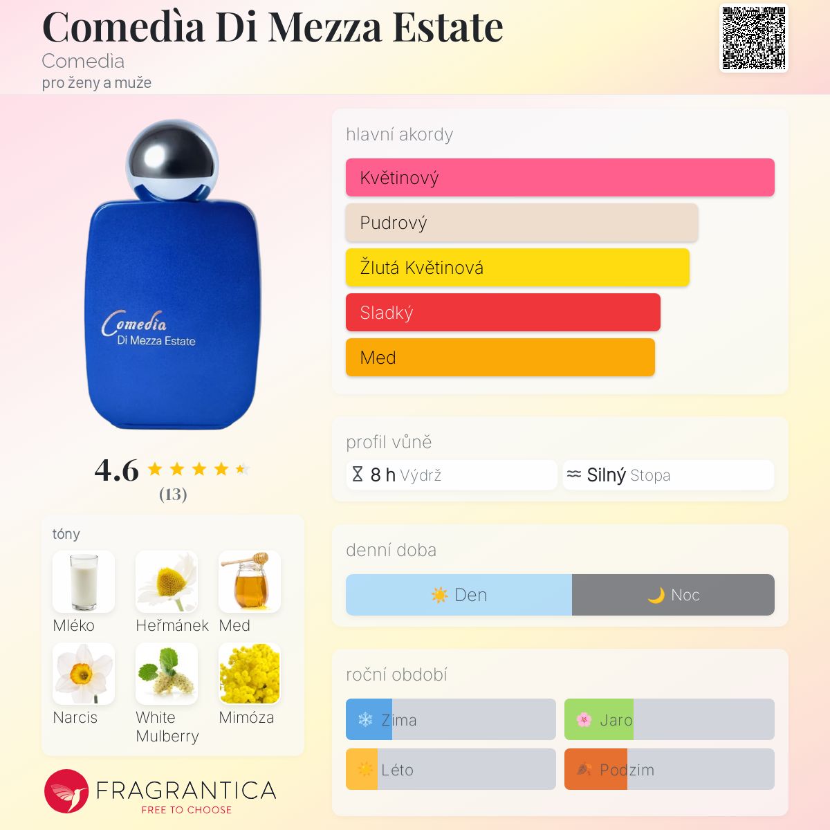Comedìa Di Mezza Estate podle Comedìa je Floral vůně pro ženy a muže. Toto je nová vůně. Comedìa Di Mezza Estate byl/a uveden/a v roce 2025. "Nosem" za touto vůní je Edoardo Tacconi. Vrchní tóny jsou Mléko, White Mulberry a Mandlový květ; střední tóny jsouHeřmánek, Narcis, Mimóza, Semena mrkve a Maceška ; základní tóny jsou Med, Bavlna a Dřevité tóny.