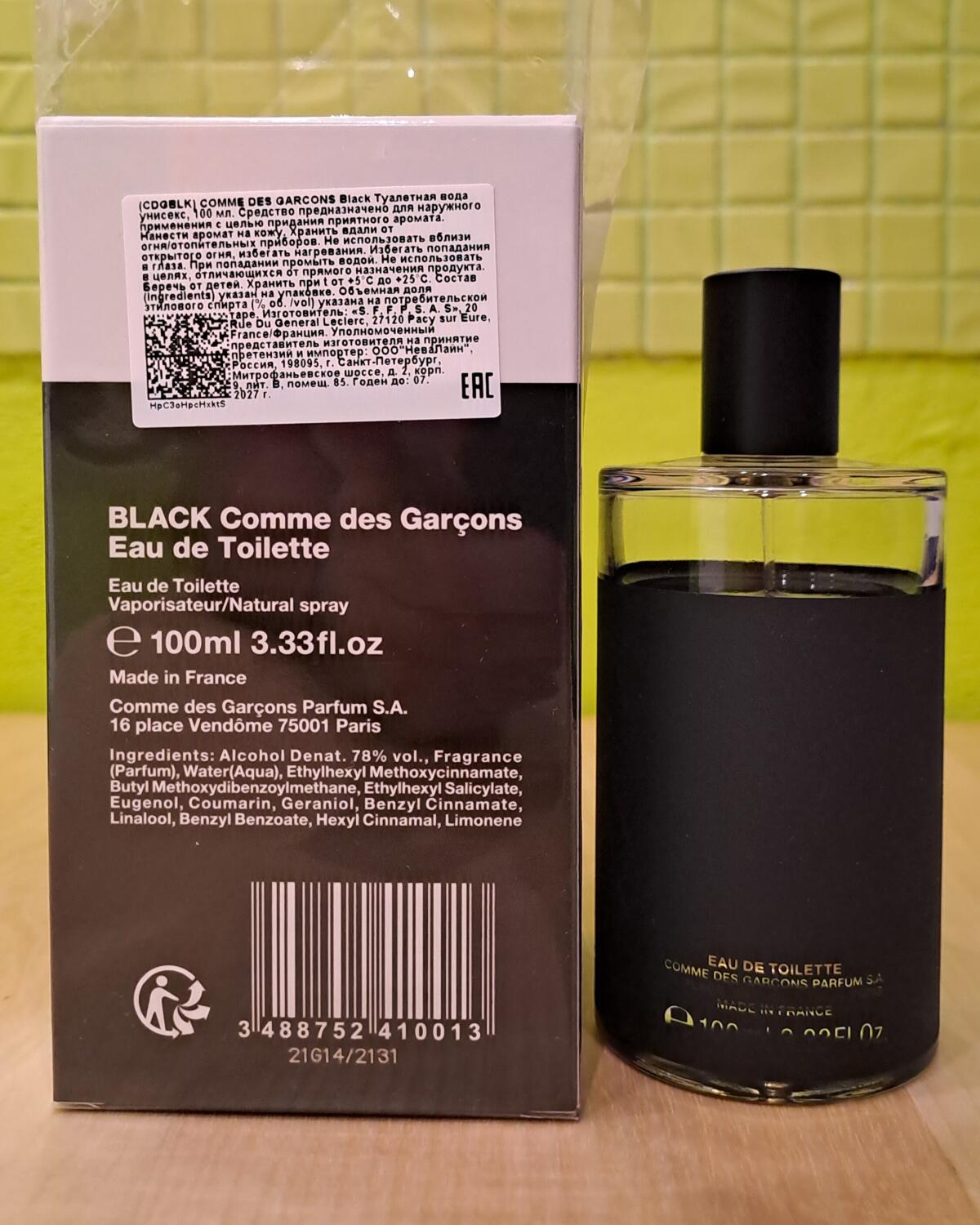 Black Eau de Toilette podle Comme des Garcons je Orientální Woody vůně pro ženy a muže. Black Eau de Toilette byl/a uveden/a v roce 2013. "Nosem" za touto vůní je Guillaume Flavigny. Vrchní tóny jsou Kadidlo, Černý pepř a Olibanum; střední tóny jsouBříza, Lékořice, Kůže a Dřevo Pepperwood™ ; základní tóny jsou Cedr a Vetiver.