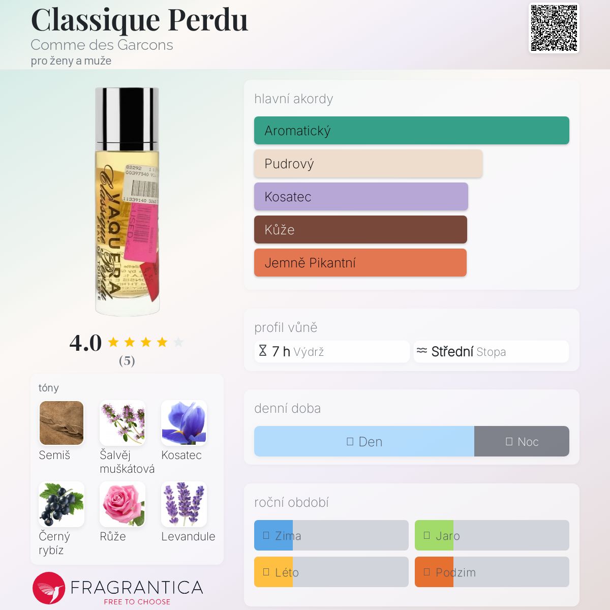 Classique Perdu podle Comme des Garcons je Aromatic Green vůně pro ženy a muže. Toto je nová vůně. Classique Perdu byl/a uveden/a v roce 2025. "Nosem" za touto vůní je Suzy Le Helley. Vrchní tóny jsou Černý rybíz, Levandule a Rajčatový list; střední tóny jsouŠalvěj muškátová, Kosatec a Růže ; základní tóny jsou Semiš, Santalové dřevo, Evernyl a Styrax.