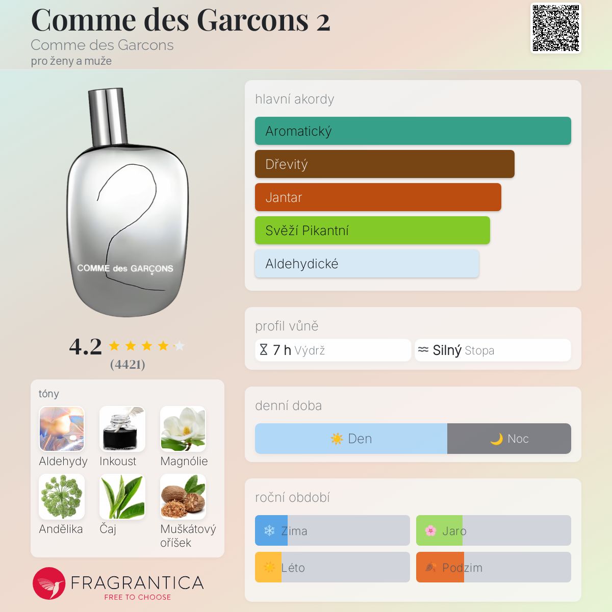 Comme des Garcons 2 podle Comme des Garcons je Chypre Floral vůně pro ženy a muže. Comme des Garcons 2 byl/a uveden/a v roce 1999. "Nosem" za touto vůní je Mark Buxton. Vrchní tóny jsou Aldehydy, Andělika, Čaj, Mandarinka a Maté; střední tóny jsouInkoust, Magnólie, Muškátový oříšek, Pimentovník, Koriandr, Kmín a Skořice ; základní tóny jsou Kadidlo, Pačuli, Vetiver, Cedr, Jantar (ambra) a Labdanum.