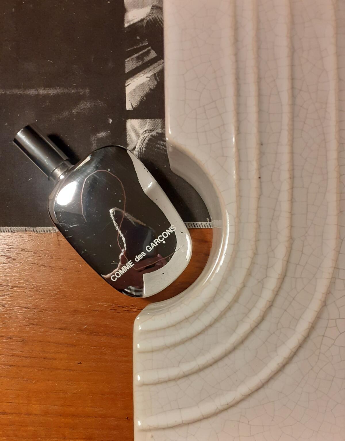 Recenze psaná se smrtí v srdci. Originální a egregorní parfém, tedy mimo módní stádo, který se otevírá silnou vůní inkoustu, řekla bych spíše grafitu, smíchanou se dvěma nebo třemi lístky, které nejsou v mé čichové paměti zrovna běžné: celkový otevírací pocit je minerální a kovový, jakýsi objev žíly, tak dlouho hledané v dole. Sušení je dlouhé a složité, závisí na spoustě věcí, které znáte lépe než já, ale v tento horký, temný večer je tu jen půlměsíc, který prořízne těch pár slov, jež letí uprostřed tolika temných tich. CDG2 je přesně tenhle řez, úzká a hluboká rána v těle vůní, rána, kterou si nosíme do úst jako první pomoc předkům, je to první chuť černé krve, podivně příjemná a krásná v tolika bailamme, návrat k našim kyselým křehkostem a v kontaktu s našimi bolestmi. Když zasychá, moje kůže uvolňuje labdanum a kadidlo, oslavuje obřadní očistu tolika originálů, vynáší ze země nejhlubší a nejpřednější humory posvátna, odpovídá na ticho měsíce (Che fai tu luna in ciel, dimmi, che fai silenziosa luna) monodickou písní propastí. Krásná, spíš jako poločasy, které slavně už neexistují, vertikální vůně, která stoupá jako modlitba poražené lásky a klesá stejnou rychlostí jako slzy. Fossatiho verše, které by dnes večer mohly provázet nositele CDG2: "To tam venku je železný vlak se srdcem z vápna, dech kyseliny a jedu, lavina lásky proti sklenici octa, po posledním polibku, než vlak zapíská." A když se chystáte vystoupit z vagonu, poslední "Ahoj" je střih a tma.