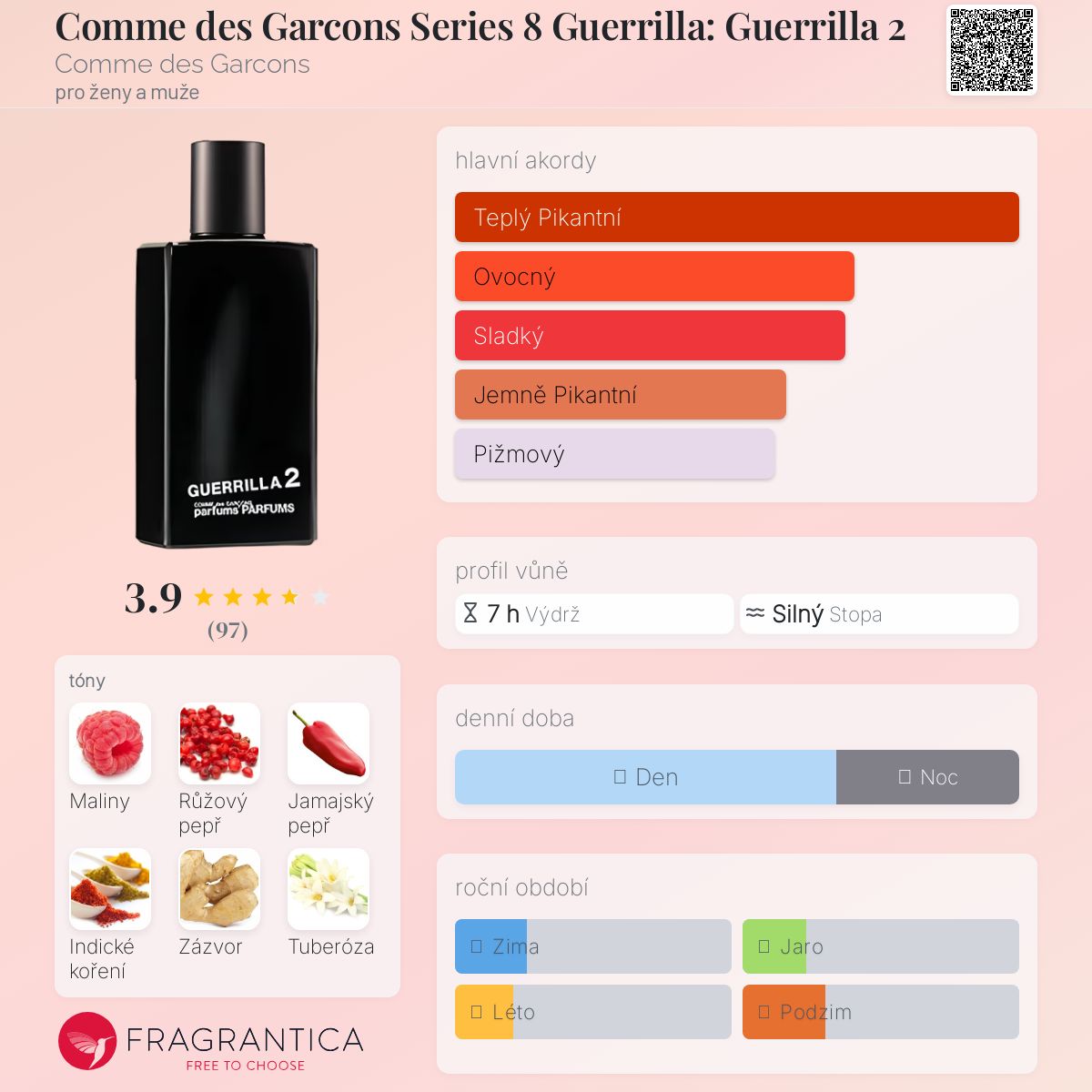 Comme des Garcons Series 8 Guerrilla: Guerrilla 2 podle Comme des Garcons je Aromatic Fruity vůně pro ženy a muže. Comme des Garcons Series 8 Guerrilla: Guerrilla 2 byl/a uveden/a v roce 2006. "Nosem" za touto vůní je Nathalie Feisthauer. Vrchní tóny jsou Růžový pepř, Zázvor a Bergamot; střední tóny jsouMaliny, Paprika, Indické koření a Tuberóza ; základní tóny jsou Pižmo, Vetiver a Cedr.