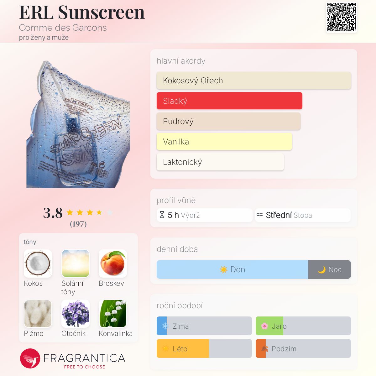 ERL Sunscreen podle Comme des Garcons je Floral Woody Musk vůně pro ženy a muže. ERL Sunscreen byl/a uveden/a v roce 2021. "Nosem" za touto vůní je Nelly Hachem-Ruiz. Vrchní tóny jsou Solární tóny a Bergamot; střední tóny jsouBroskev, Otočník a Konvalinka ; základní tóny jsou Kokos, Pižmo a Cedr.
