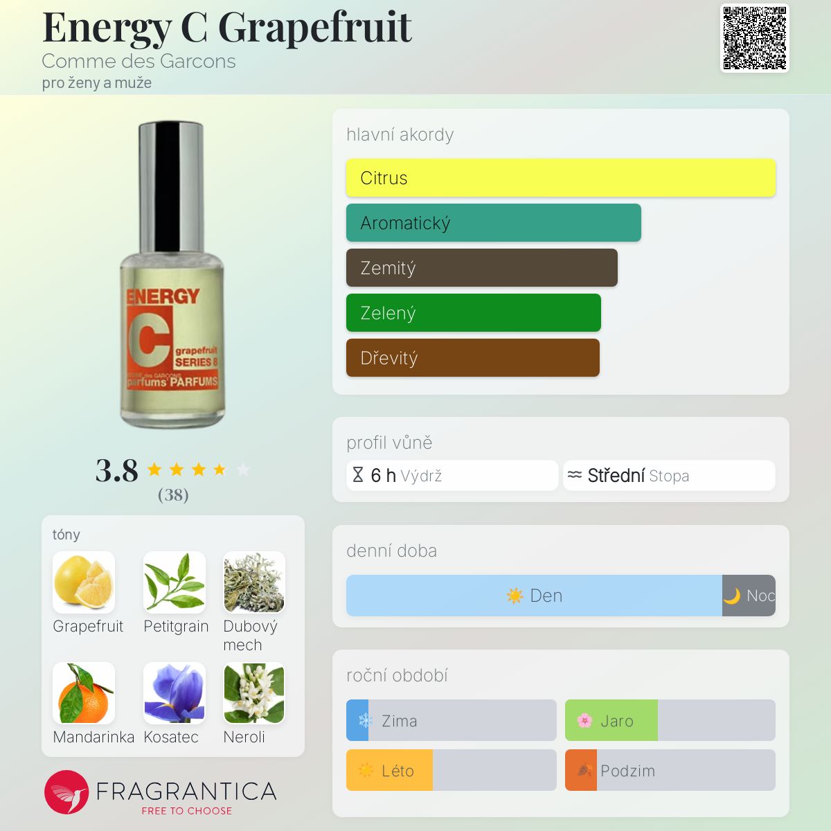 Energy C Grapefruit podle Comme des Garcons je Citrus vůně pro ženy a muže. Energy C Grapefruit byl/a uveden/a v roce 2008. "Nosem" za touto vůní je Nathalie Feisthauer. Vrchní tóny jsou Grapefruit, Petitgrain a Černý rybíz; střední tóny jsouMandarinka, Neroli a Jasmín ; základní tóny jsou Dubový mech, Kosatec, Pižmo a Vetiver.