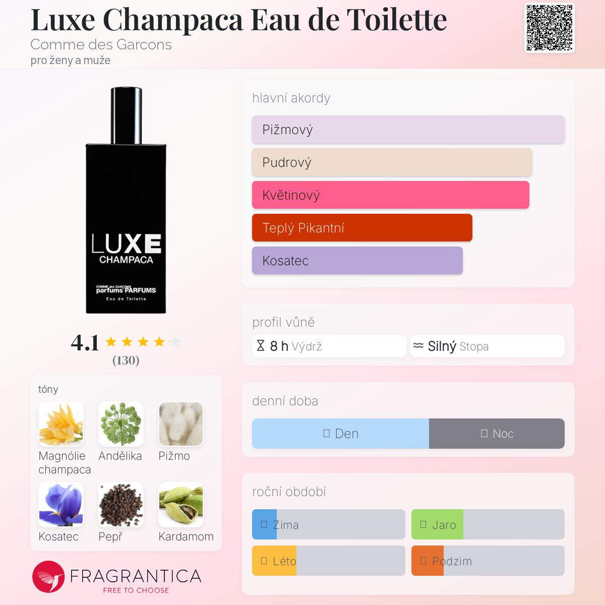 Luxe Champaca Eau de Toilette podle Comme des Garcons je Floral Woody Musk vůně pro ženy a muže. Luxe Champaca Eau de Toilette byl/a uveden/a v roce 2007. "Nosem" za touto vůní je Nathalie Feisthauer.