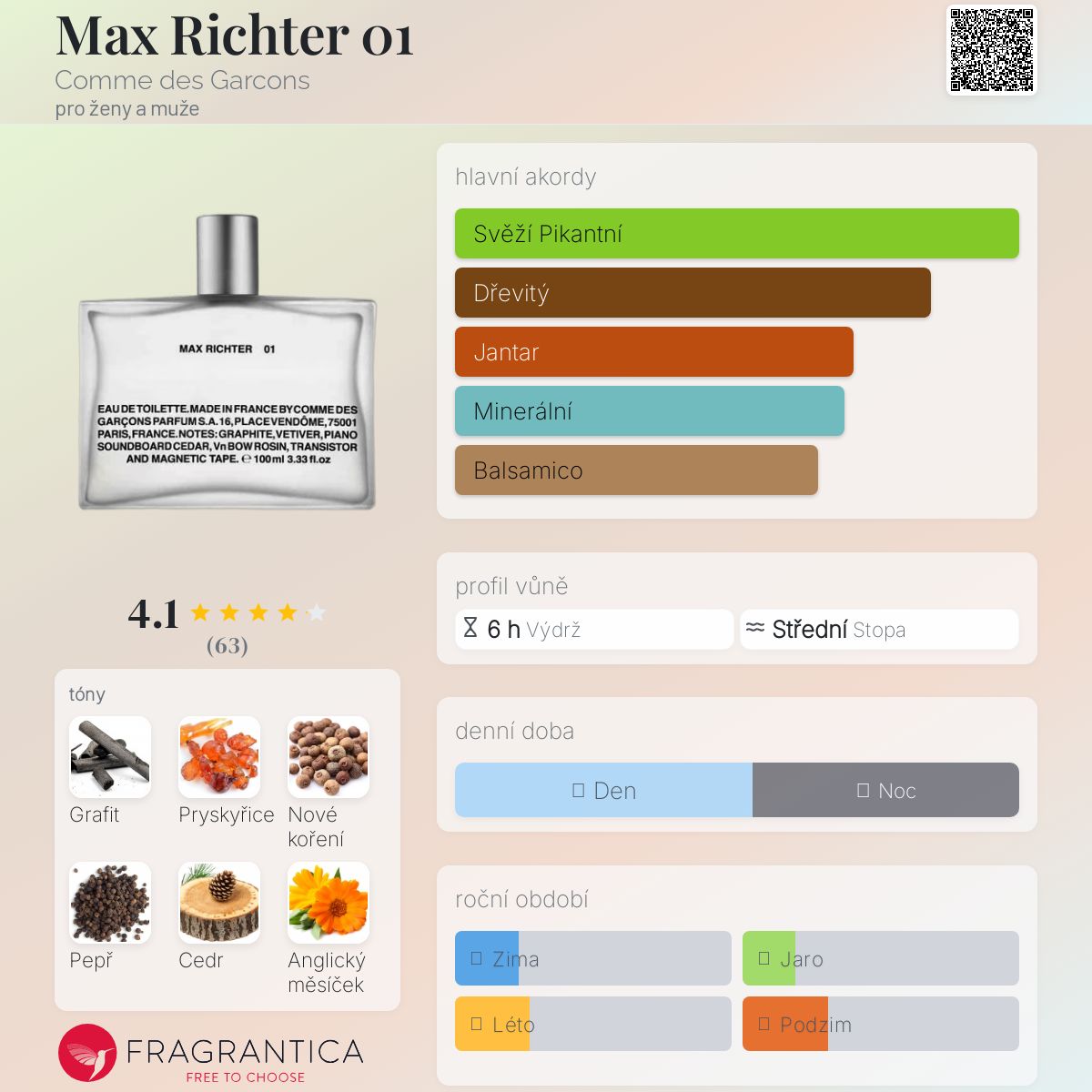 Max Richter 01 podle Comme des Garcons je Woody vůně pro ženy a muže. Toto je nová vůně. Max Richter 01 byl/a uveden/a v roce 2025. "Nosem" za touto vůní je Guillaume Flavigny. Vrchní tóny jsou Kmín a Ylang-Ylang; střední tóny jsouNové koření, Černý pepř a Měsíček ; základní tóny jsou Grafit, Pryskyřice, Cedr, Vetiver a Pačuli.