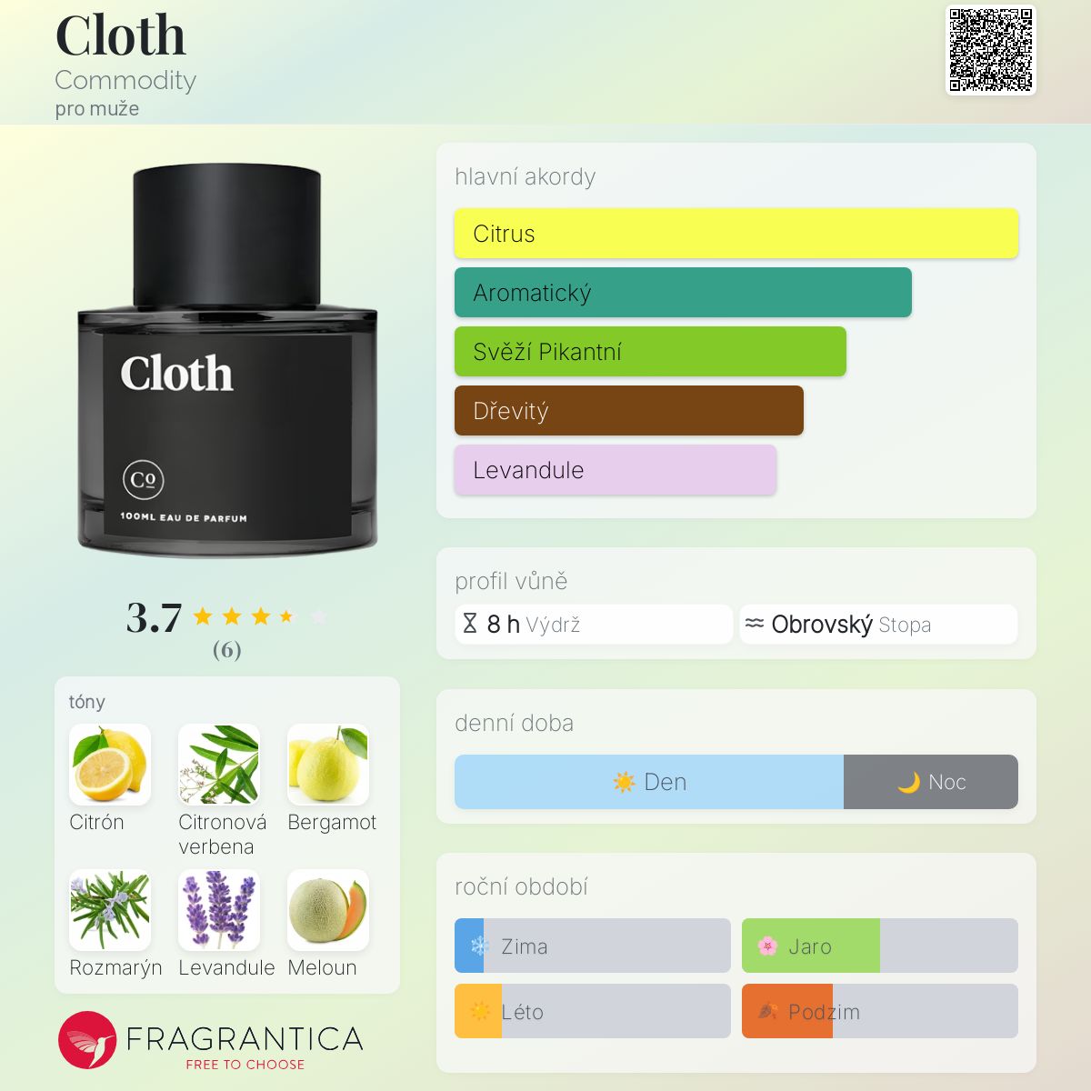 Cloth podle Commodity je Aromatic Fougere vůně pro muže. Cloth byl/a uveden/a v roce 2013. Vrchní tóny jsou Citrón, Bergamot a Meloun; střední tóny jsouCitronová verbena, Rozmarýn a Levandule ; základní tóny jsou Bílé pižmo, Pačuli a Dubový mech.