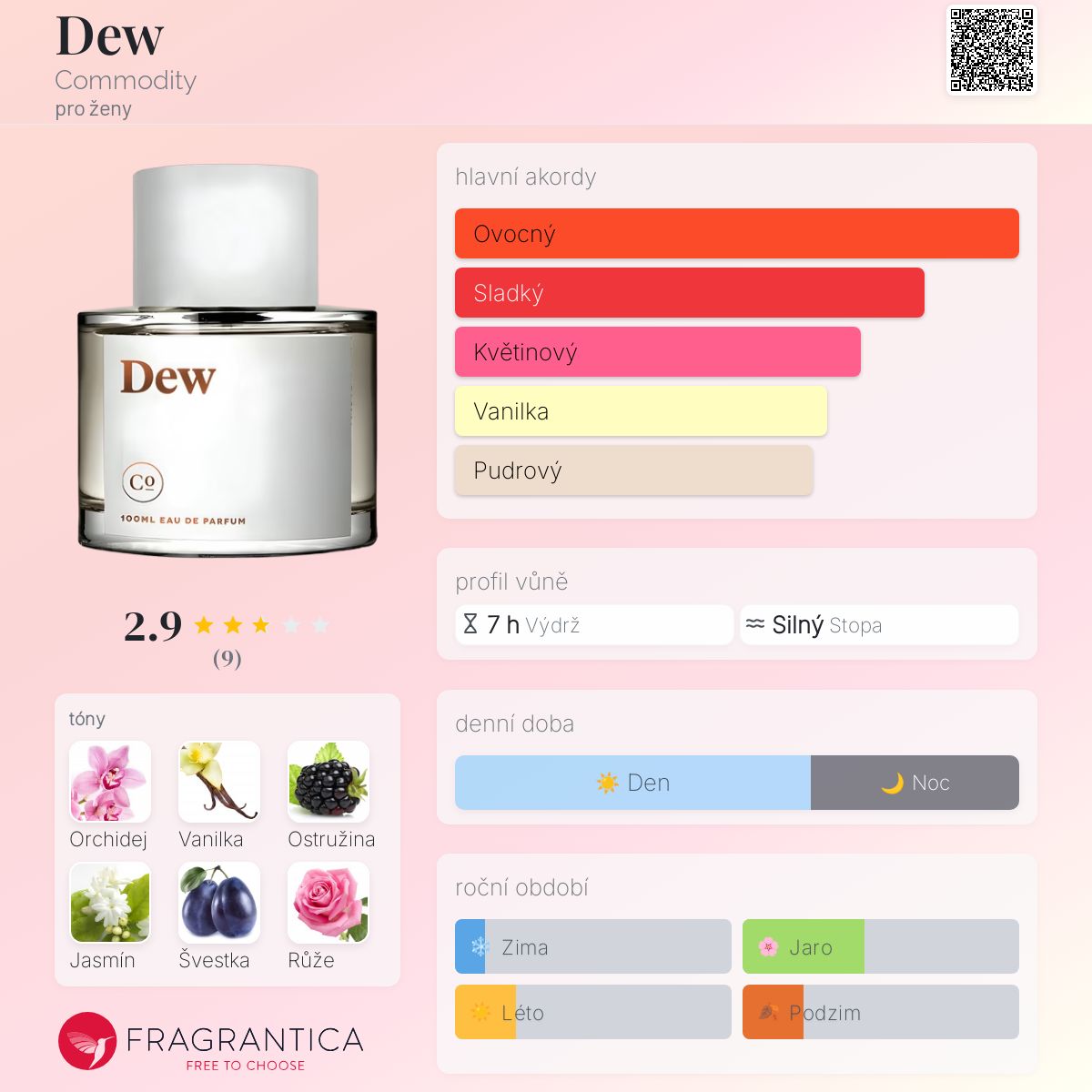 Dew podle Commodity je Floral Fruity vůně pro ženy. Dew byl/a uveden/a v roce 2013. Vrchní tóny jsou Italská mandarinka, Broskev, Meloun a Hruška; střední tóny jsouOrchidej, Jasmín, Švestka, Turecká růže a Fialka ; základní tóny jsou Madagaskarská vanilka, Ostružina, Pižmo a Cedr.