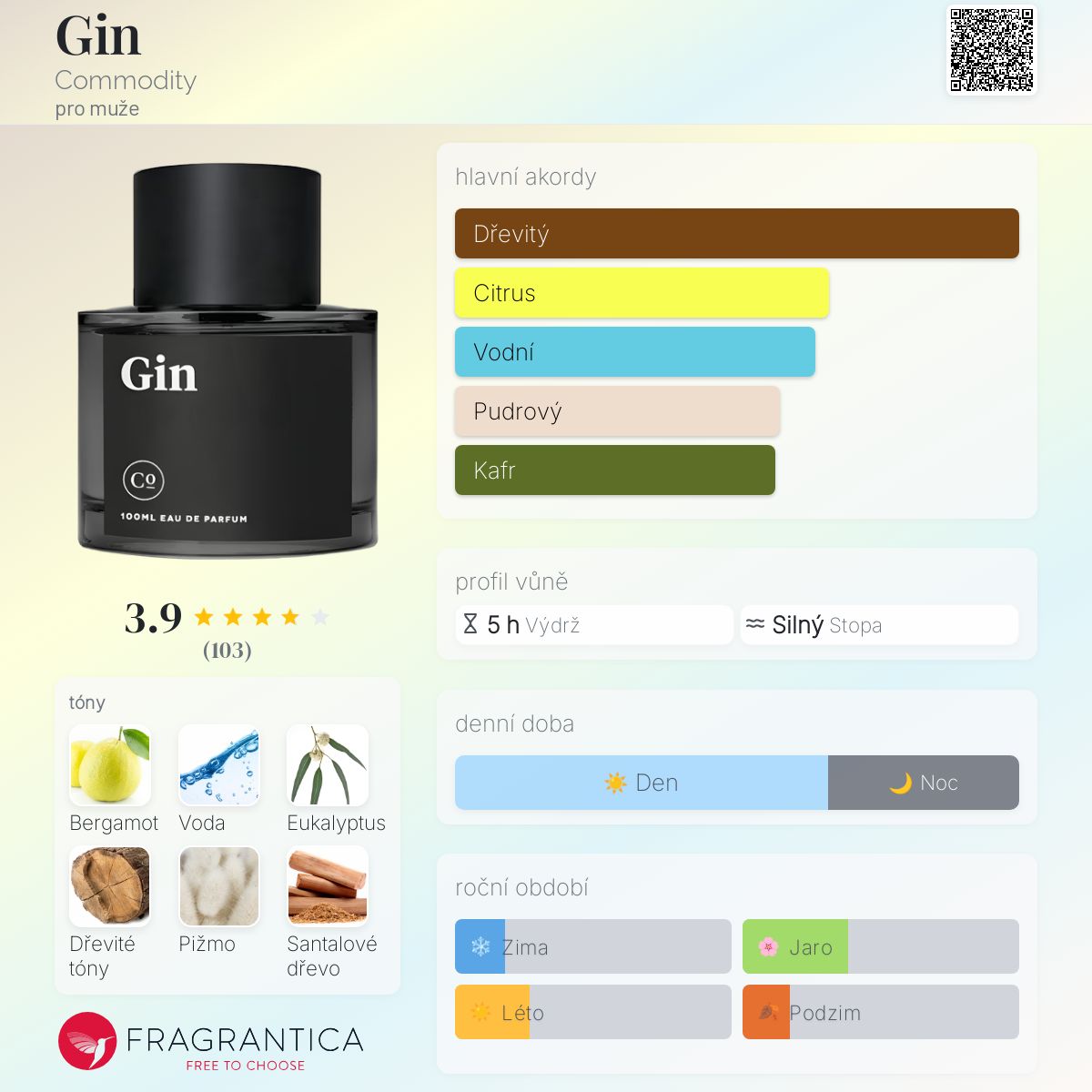 Gin podle Commodity je Woody Aromatic vůně pro muže. Gin byl/a uveden/a v roce 2013. Vrchní tóny jsou Bergamot, Vodnaté tóny a Eukalyptus; střední tóny jsouBílé dřevo, Jasmín a Kůže ; základní tóny jsou Pižmo, Santalové dřevo a Pačuli.