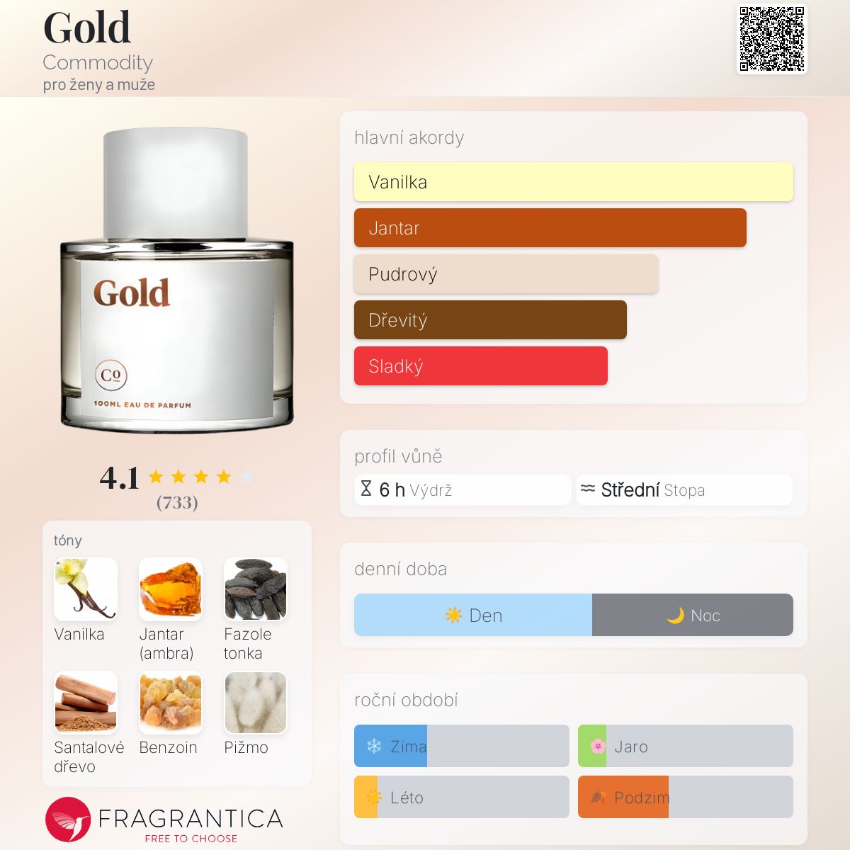 Gold podle Commodity je Orientální vůně pro ženy a muže. Gold byl/a uveden/a v roce 2013. "Nosem" za touto vůní je Donna Ramanauskas. Vrchní tóny jsou Kafr, Jalovcové bobulky a Bergamot; střední tóny jsouJantar (ambra), Benzoin a Haitský vetiver ; základní tóny jsou Vanilka, Fazole tonka, Santalové dřevo a Pižmo.