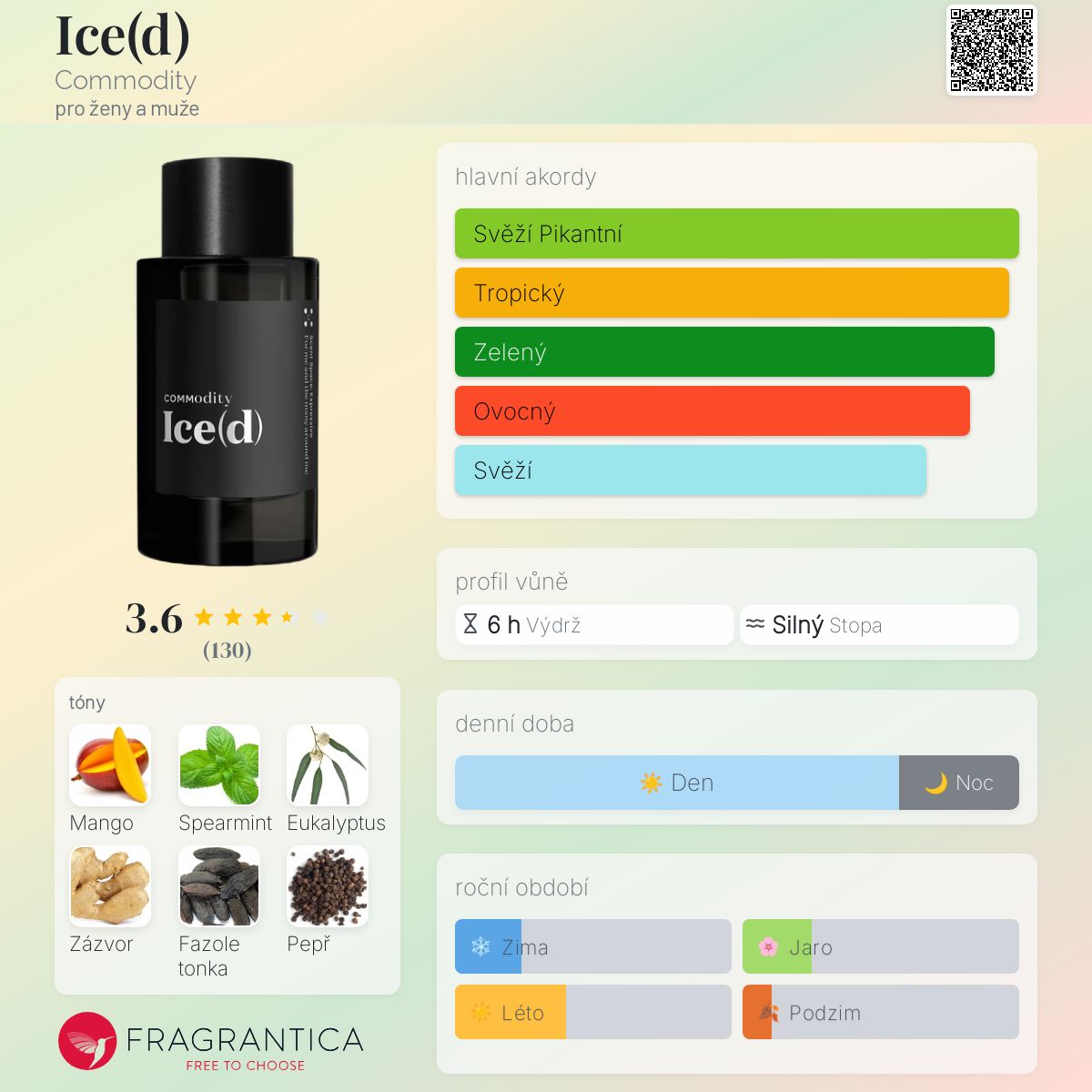 Ice(d) podle Commodity je Aromatic Fruity vůně pro ženy a muže. Toto je nová vůně. Ice(d) byl/a uveden/a v roce 2025. "Nosem" za touto vůní je Caroline Sabas. Vrchní tóny jsou Ojíněné mango a Máta kadeřavá; střední tóny jsouEukalyptus, Zázvor a Černý pepř ; základní tóny jsou Fazole tonka a Jantar (ambra).