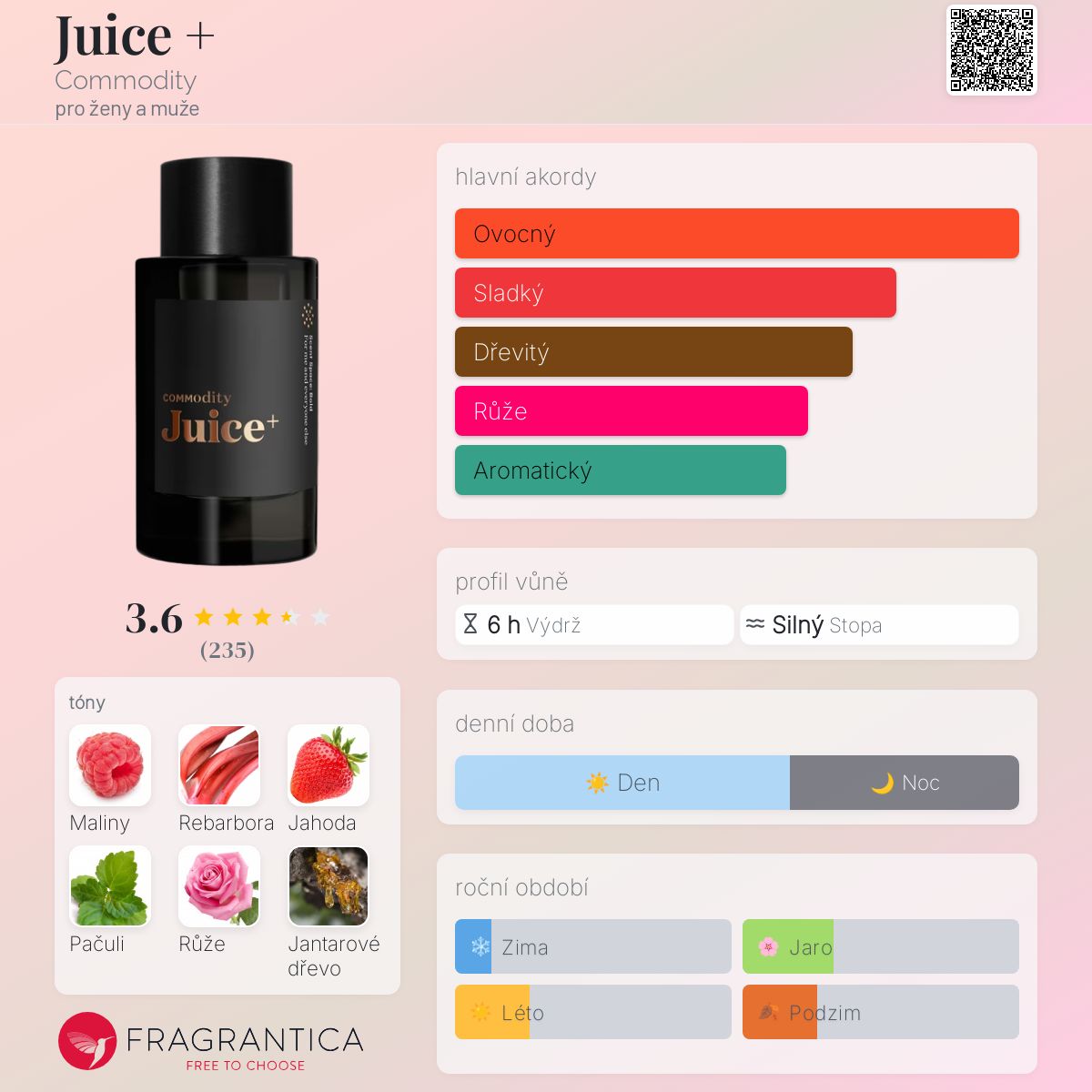 Juice + podle Commodity je Aromatic Fruity vůně pro ženy a muže. Juice + byl/a uveden/a v roce 2024. "Nosem" za touto vůní je Nathalie Benareau. Vrchní tóny jsou Maliny a Jahoda; střední tóny jsouRebarbora, Bulharská růže a Brambořík ; základní tóny jsou Pačuli, Jantarové dřevo a Vetiver.