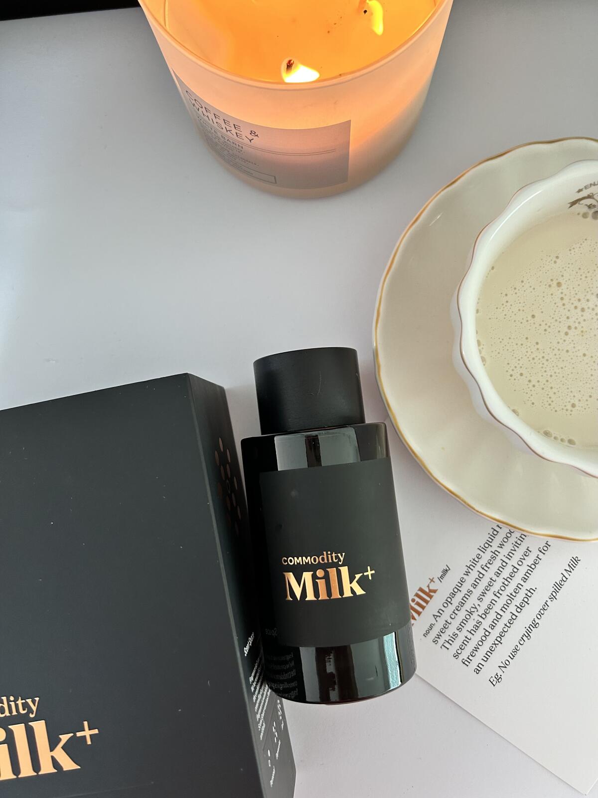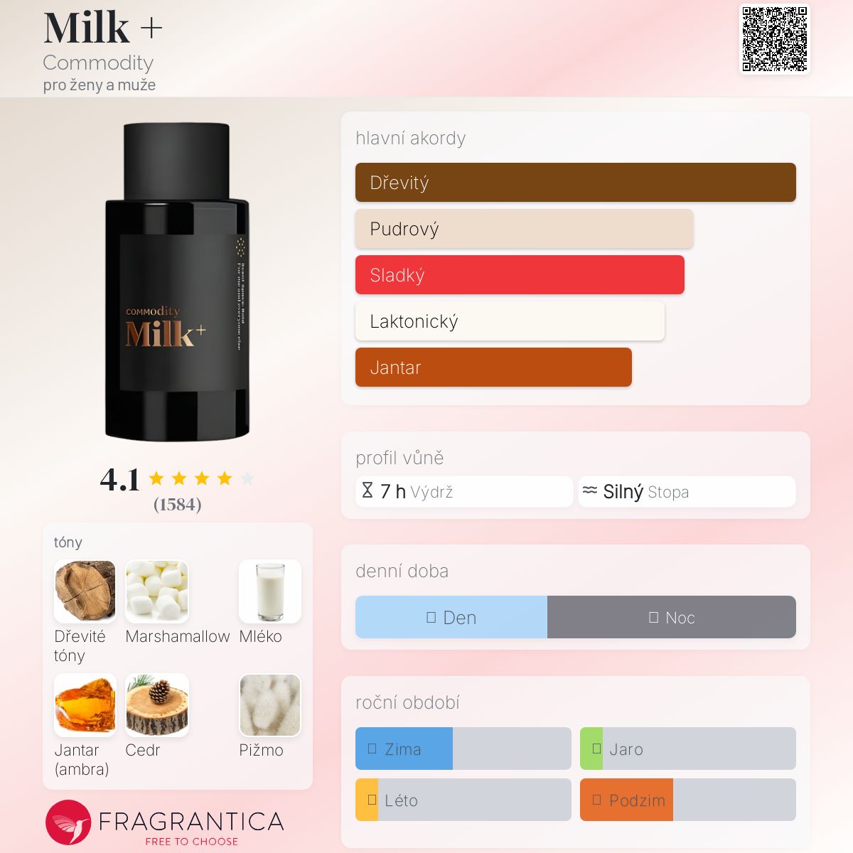 Milk + podle Commodity je Orientální Woody vůně pro ženy a muže. Milk + byl/a uveden/a v roce 2021. Vrchní tóny jsou Marshamallow a Mléko; střední tóny jsouExtrakt z bílého cedru a Pižmo ; základní tóny jsou Dřevité tóny a Jantar (ambra).