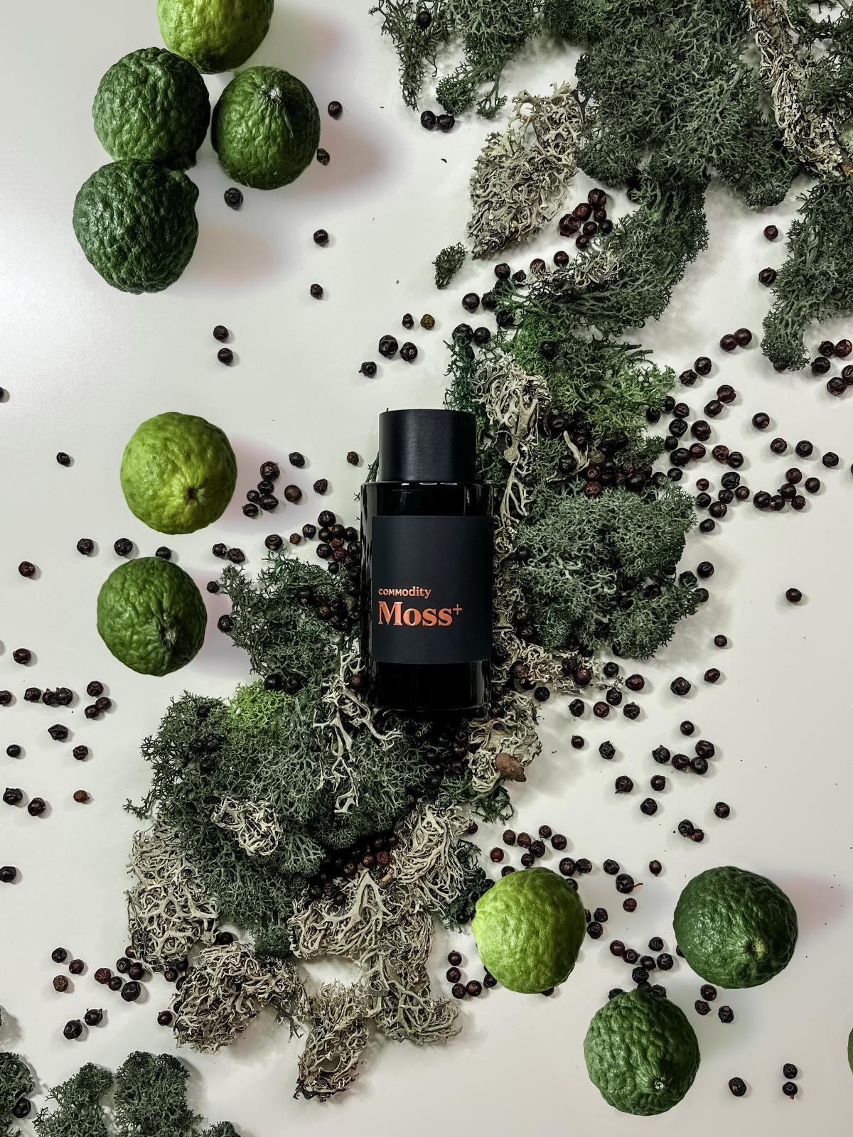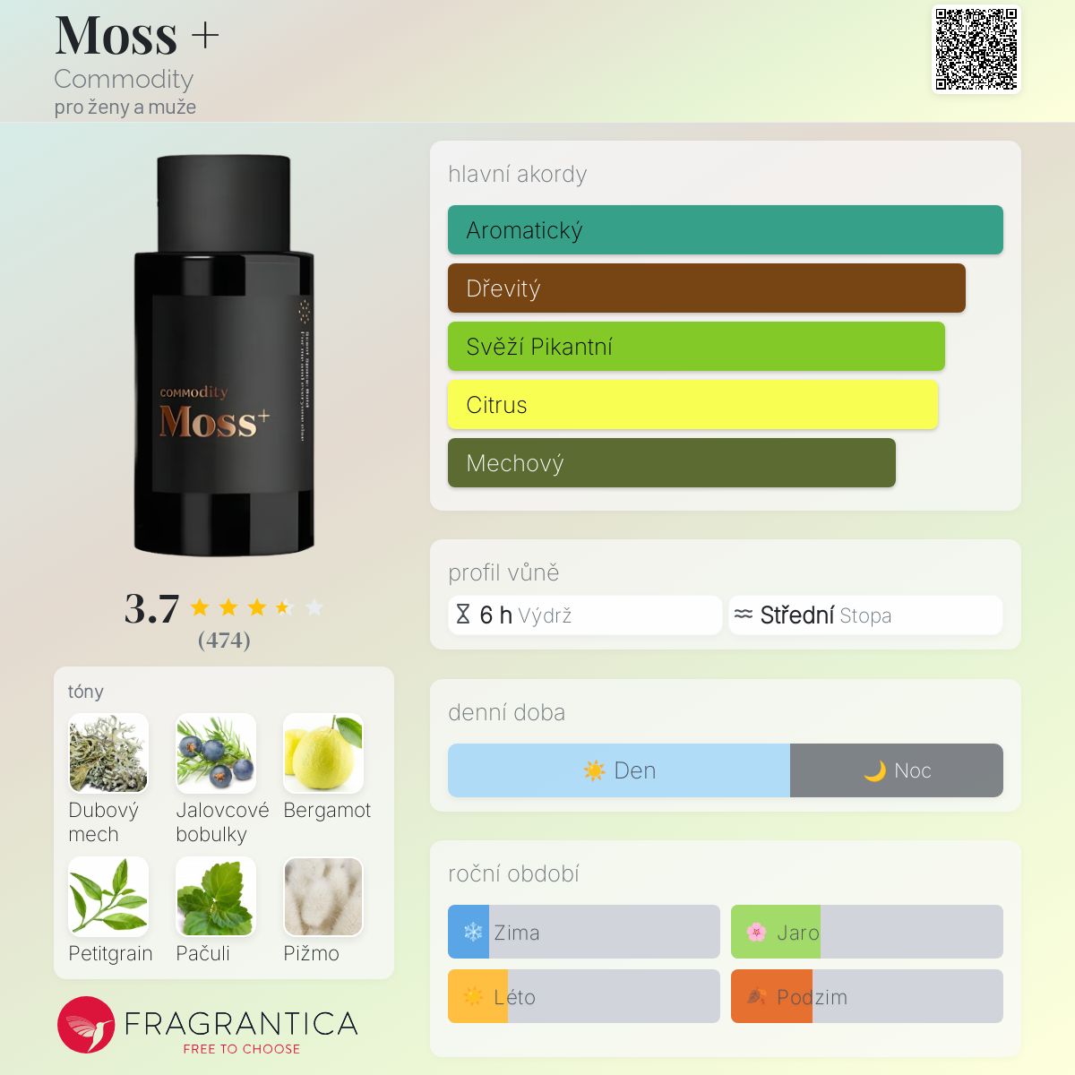 Moss + podle Commodity je vůně pro ženy a muže. Moss + byl/a uveden/a v roce 2021. Vrchní tóny jsou Dubový mech, Bergamot a Petitgrain; střední tón jePižmo ; základní tóny jsou Jalovcové bobulky a Pačuli.