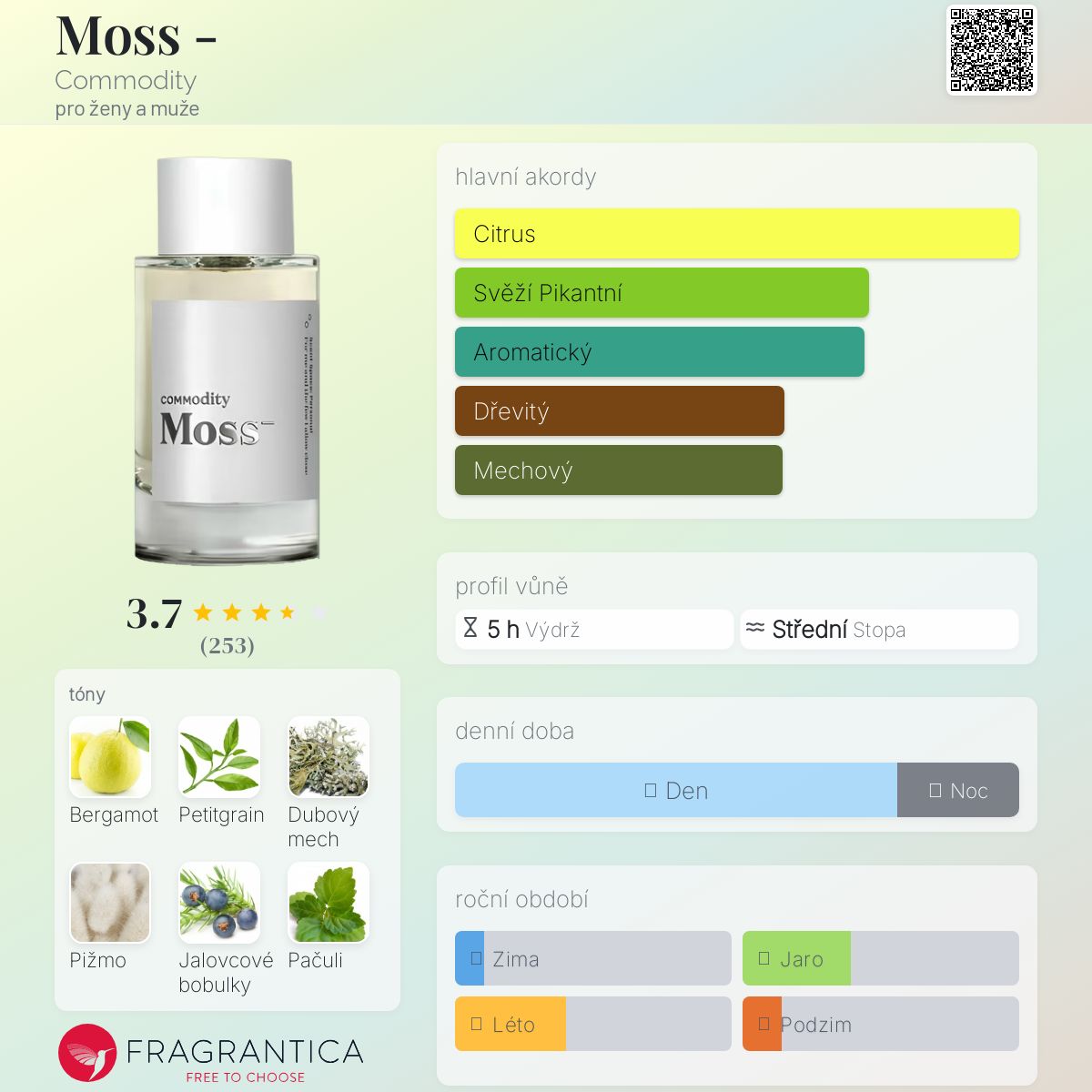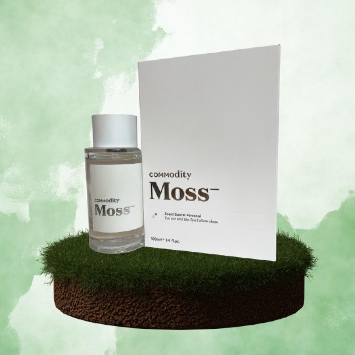 Moss - podle Commodity je vůně pro ženy a muže. Moss - byl/a uveden/a v roce 2021. Vrchní tóny jsou Bergamot, Petitgrain a Dubový mech; střední tón jePižmo ; základní tóny jsou Jalovcové bobulky a Pačuli.
