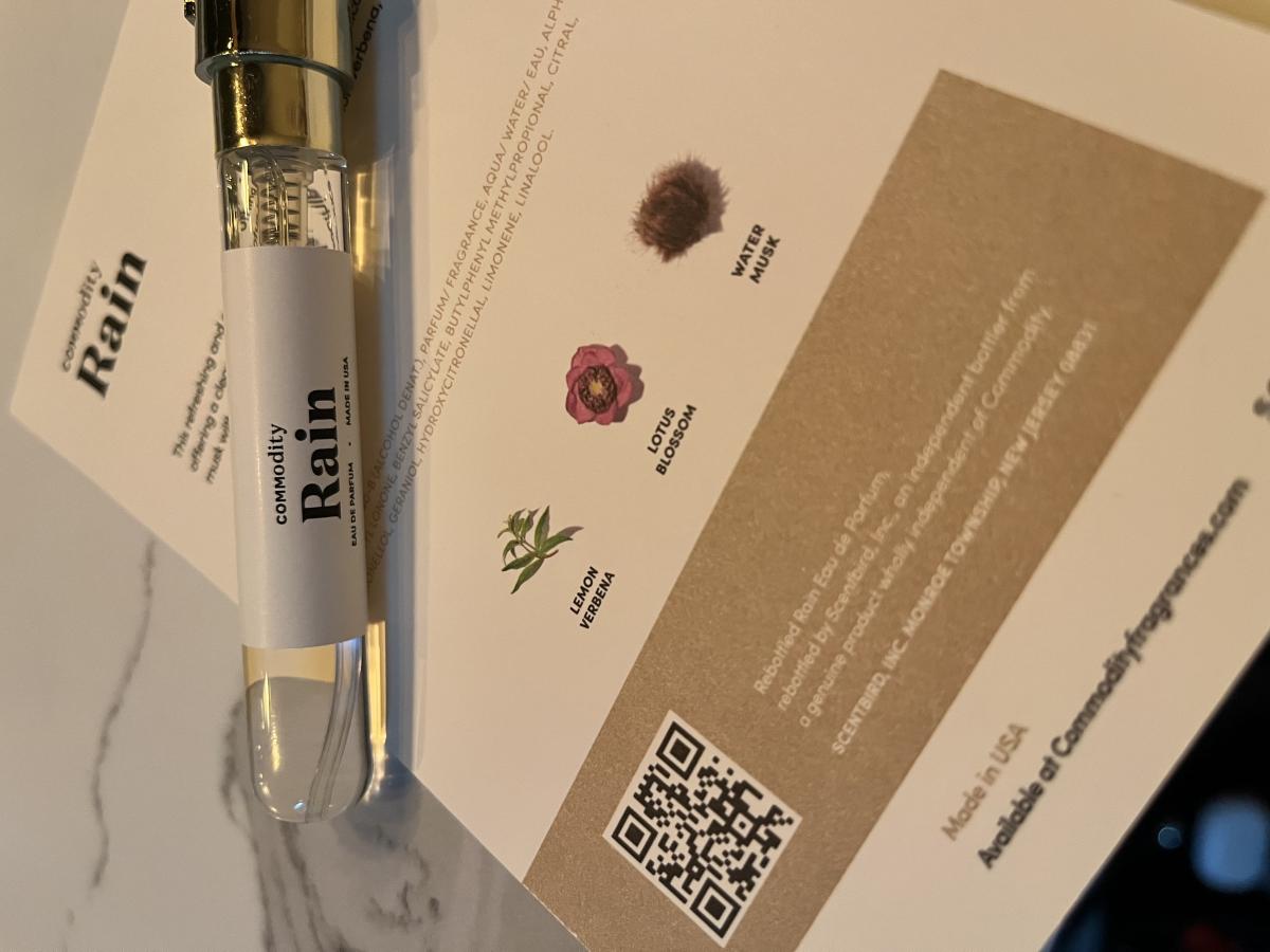 Rain podle Commodity je Floral Aquatic vůně pro ženy a muže. Rain byl/a uveden/a v roce 2013. "Nosem" za touto vůní je Ketrin Leka. Vrchní tóny jsou Citronová verbena a Bergamot; střední tóny jsouLotus, Frézie a Jasmín ; základní tóny jsou Pižmo, Vetiver a Dřevité tóny.