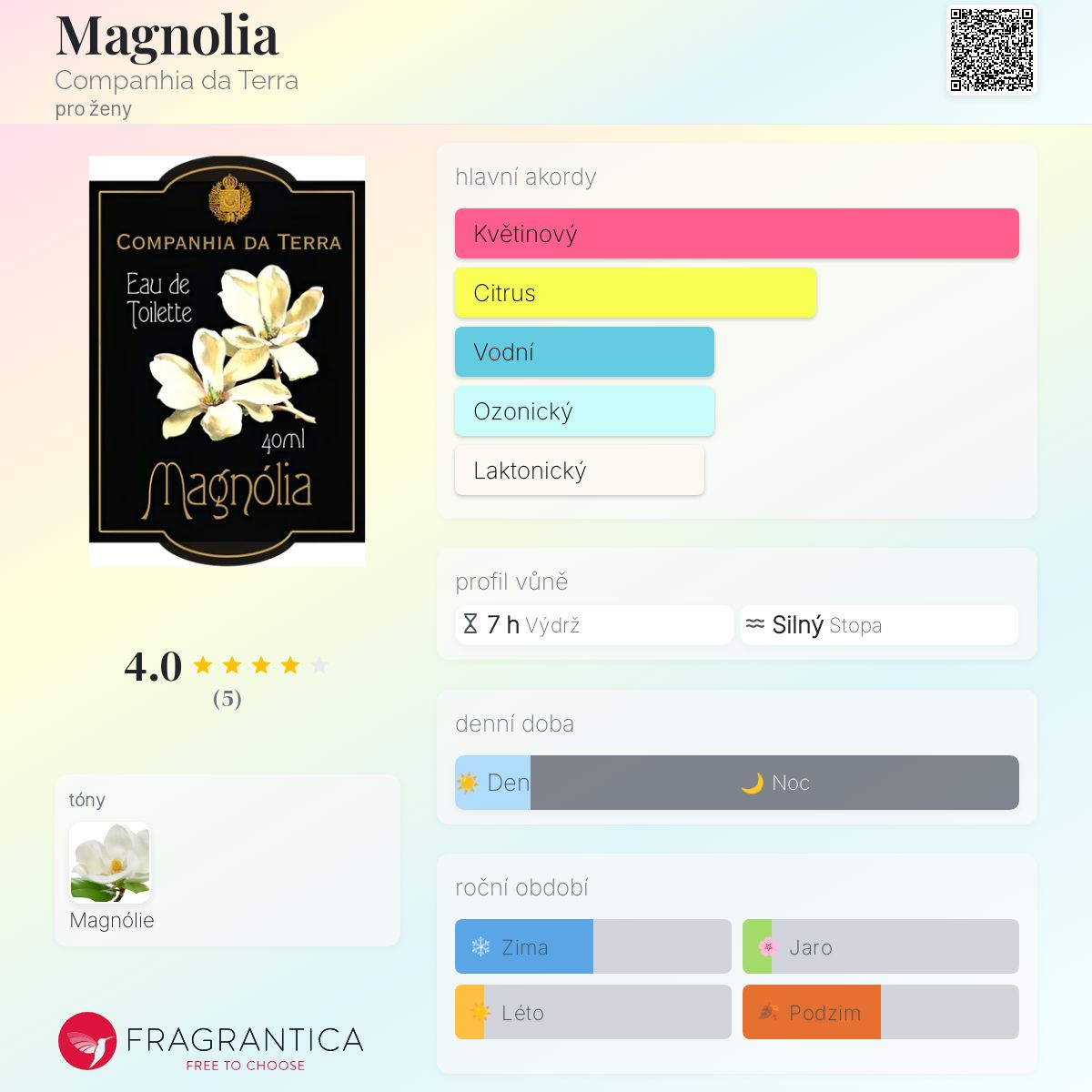 Magnolia podle Companhia da Terra je Floral vůně pro ženy. Magnolia byl/a uveden/a v roce 1981. "Nosem" za touto vůní je Ricardo Penafiel Malta.