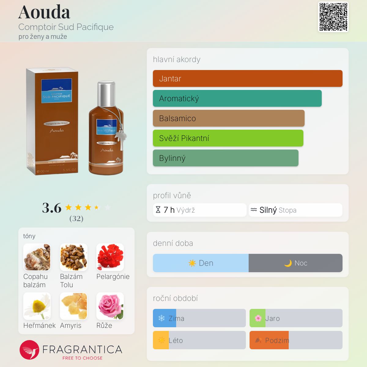 Aouda podle Comptoir Sud Pacifique je vůně pro ženy a muže. Aouda byl/a uveden/a v roce 2009. Vrchní tóny jsou Pelargónie, Heřmánek a Růže; střední tóny jsouCopahu balzám, Amyris, Virginský cedr a Myrta ; základní tóny jsou Balzám Tolu, Agarové dřevo (oud) a Pačuli.