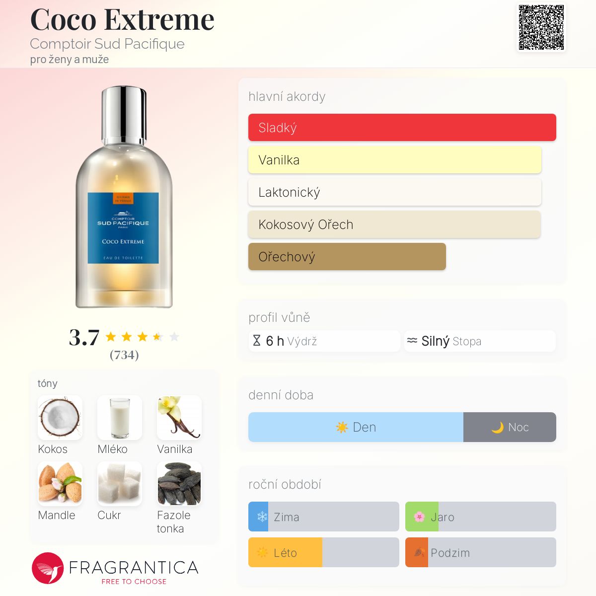 Coco Extreme podle Comptoir Sud Pacifique je Orientální Vanilla vůně pro ženy a muže. Coco Extreme byl/a uveden/a v roce 2007. Vrchní tóny jsou Kokos a Vanilkový květ; střední tóny jsouKokos, Mléko, Mandle a Fazole tonka ; základní tóny jsou Kokos, Vanilka a Cukr.