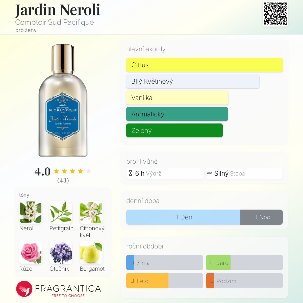 Jardin Neroli podle Comptoir Sud Pacifique je Orientální Floral vůně pro ženy. Jardin Neroli byl/a uveden/a v roce 2014. Vrchní tóny jsou Petitgrain, Růže a Bergamot; střední tóny jsouNeroli, Citronový květ a Otočník ; základní tóny jsou Pižmo, Fazole tonka a Vanilka.