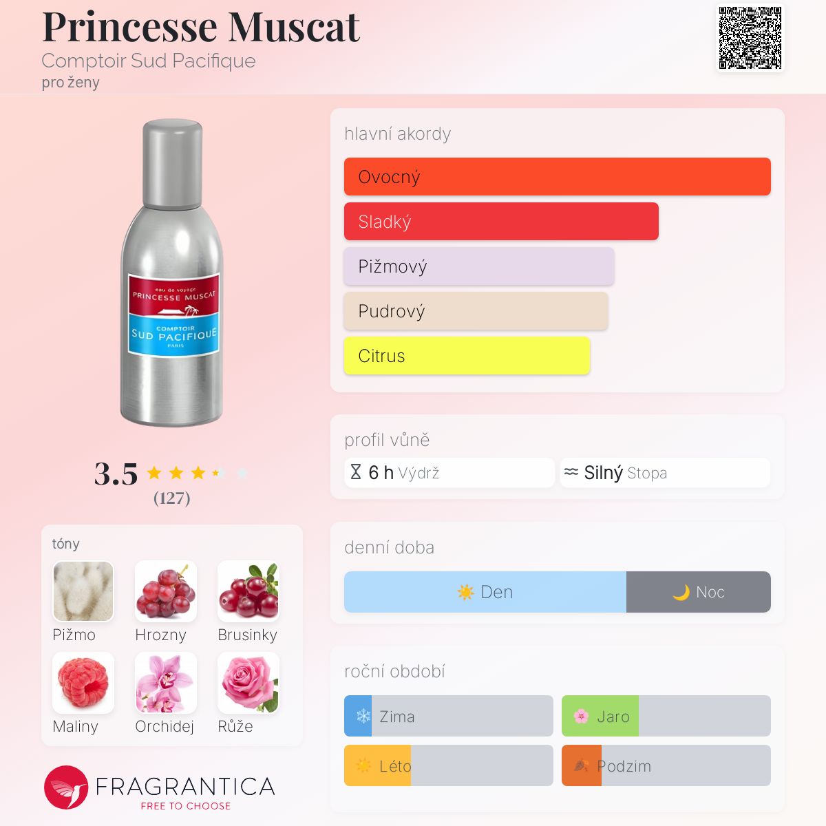 Princesse Muscat podle Comptoir Sud Pacifique je Floral Fruity vůně pro ženy. Princesse Muscat byl/a uveden/a v roce 2000. Vrchní tóny jsou Brusinky, Maliny, Grapefruit a Bergamot; střední tóny jsouOrchidej, Růže, Mango a Jasmín ; základní tóny jsou Pižmo, Hrozny a Santalové dřevo.
