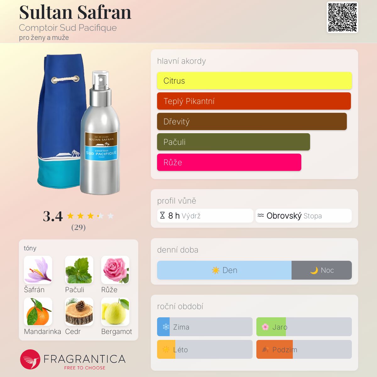 Sultan Safran podle Comptoir Sud Pacifique je Orientální Woody vůně pro ženy a muže. Sultan Safran byl/a uveden/a v roce 1996. Vrchní tóny jsou Mandarinka a Bergamot; střední tóny jsouŠafrán, Růže, Jasmín a Konvalinka ; základní tóny jsou Pačuli, Cedr a Pižmo.