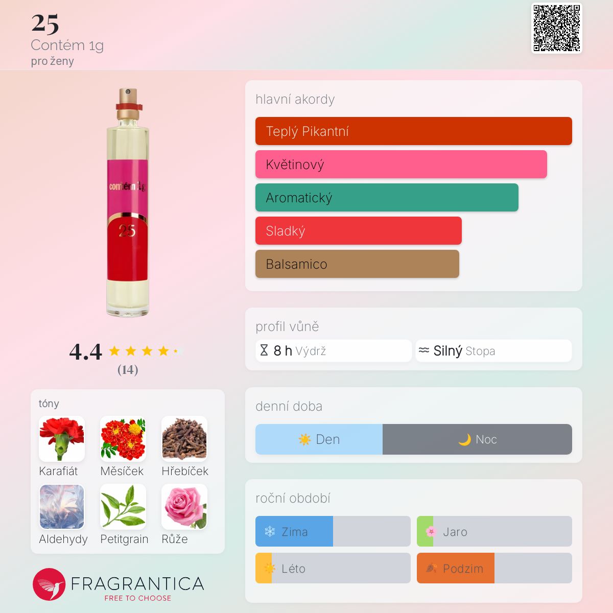 25 podle Contém 1g je Orientální Floral vůně pro ženy. 25 byl/a uveden/a v roce 1993. "Nosem" za touto vůní je Rogério Rubini. Vrchní tóny jsou Aldehydy, Petitgrain, Mandarinka a Citrón; střední tóny jsouKarafiát, Aksamitník, Hřebíček, Růže, Sedmikráska, Pomerančový květ, Jasmín, Konvalinka a Tuberóza ; základní tóny jsou Benzoin, Santalové dřevo, Cedr, Vanilka, Fazole tonka a Pižmo.