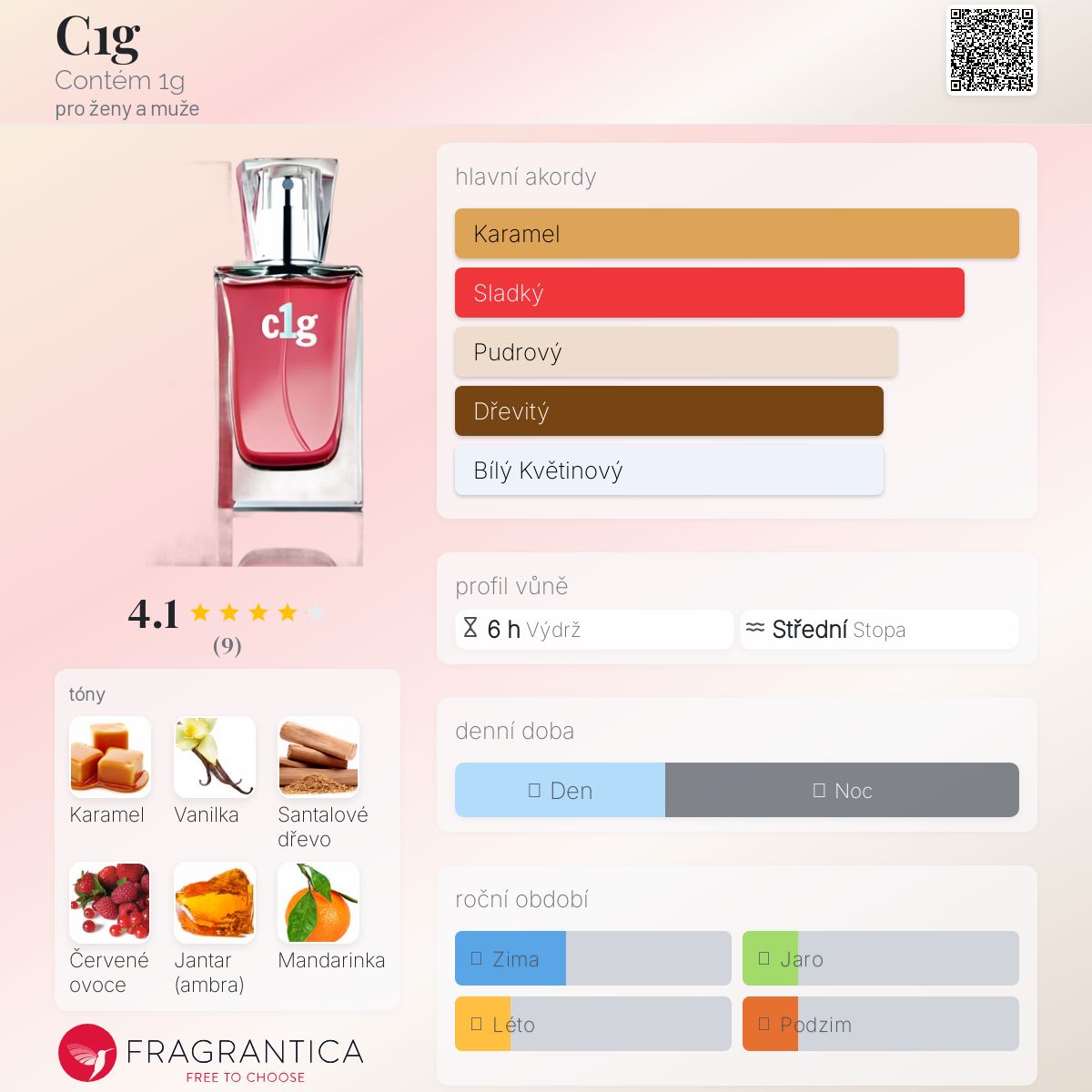 C1g podle Contém 1g je Floral Fruity vůně pro ženy a muže. C1g byl/a uveden/a v roce 2014. Vrchní tóny jsou Červené ovoce, Mandarinka a Broskev; střední tóny jsouJasmín, Gardénie, Orchidej a Pomerančový květ ; základní tóny jsou Karamel, Vanilka, Santalové dřevo a Jantar (ambra).