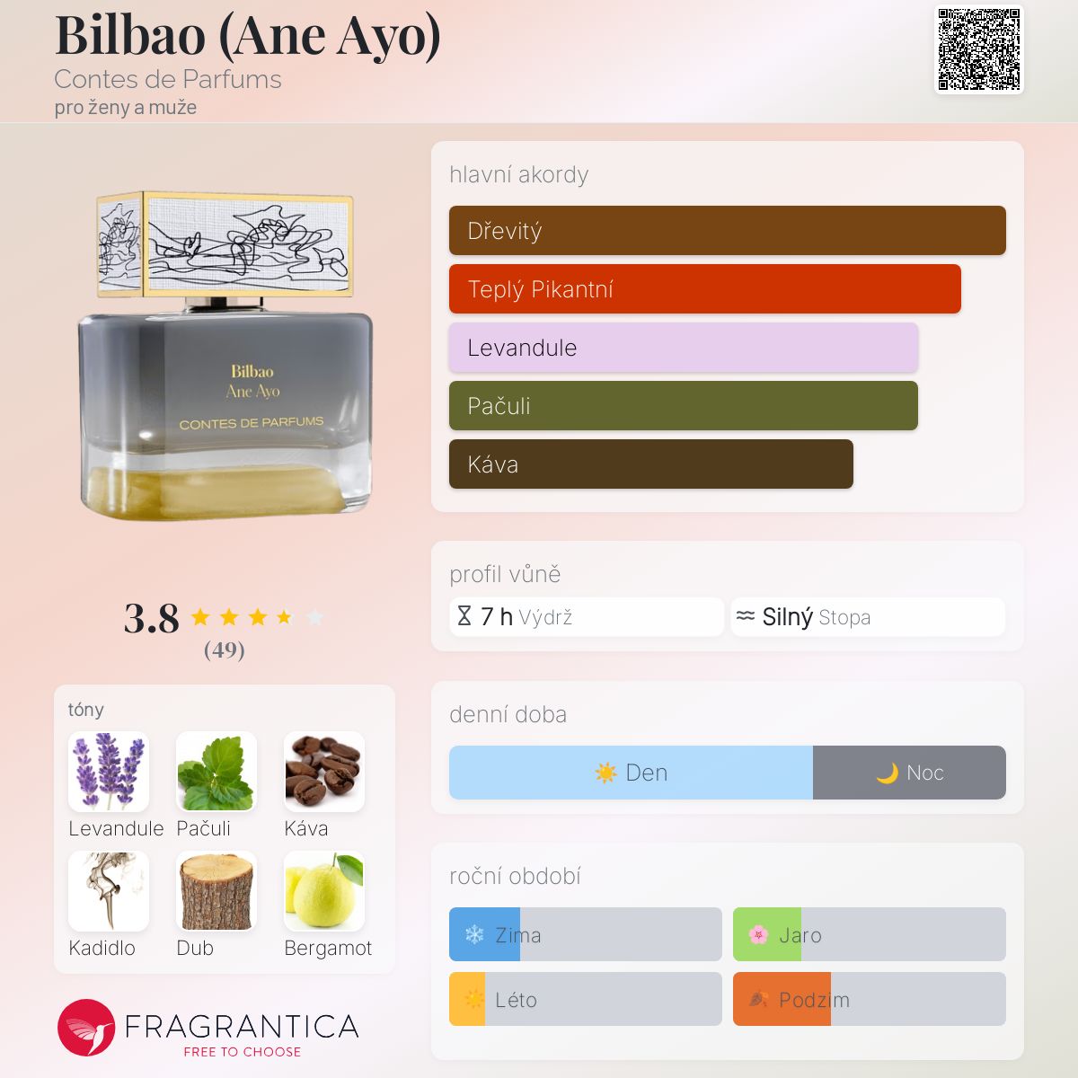 Bilbao (Ane Ayo) podle Contes de Parfums je vůně pro ženy a muže. Bilbao (Ane Ayo) byl/a uveden/a v roce 2022. "Nosem" za touto vůní je Ane Ayo. Vrchní tóny jsou Levandule, Bergamot a Růžový pepř; střední tóny jsouPačuli, Káva a Dub ; základní tóny jsou Kadidlo, Ambrox Super, Laoský oud, Liatrix a Ambrettolide.