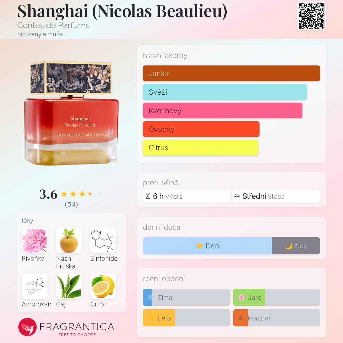 Shanghai (Nicolas Beaulieu) podle Contes de Parfums je Floral Fruity vůně pro ženy a muže. Shanghai (Nicolas Beaulieu) byl/a uveden/a v roce 2022. "Nosem" za touto vůní je Nicolas Beaulieu. Vrchní tóny jsou Nashi hruška, Čajový lístek a Citrón; střední tóny jsouČínské pivoňky, Jasmín a Kokosový nektar ; základní tóny jsou Sinfonide, Ambroxan a Vetiver.