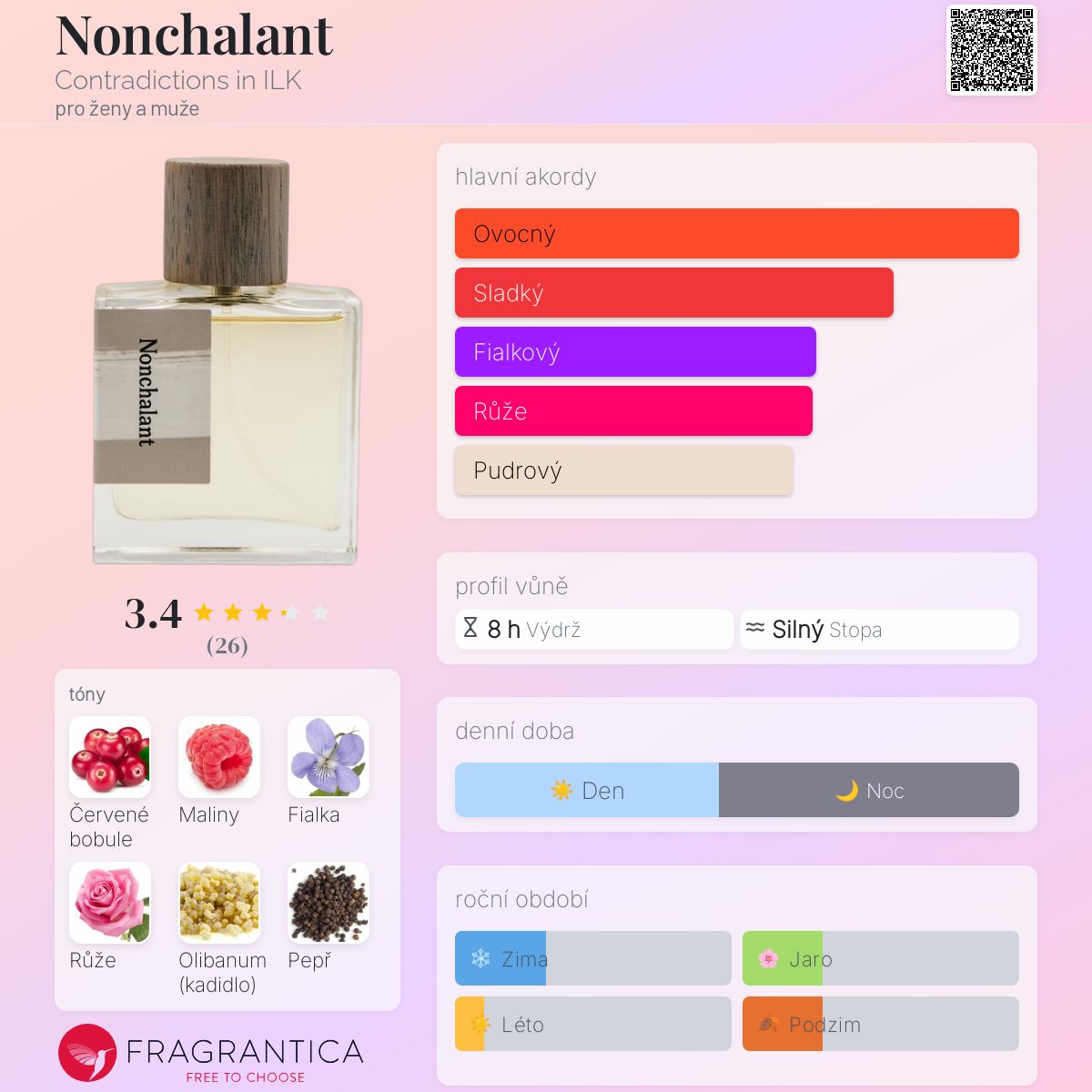 Nonchalant podle Contradictions in ILK je Chypre Floral vůně pro ženy a muže. Nonchalant byl/a uveden/a v roce 2020. Vrchní tóny jsou Červené bobule, Maliny, Pepř a Pomeranč; střední tóny jsouFialka, Růže, Skořice, Pelargónie, Brandy, Pomerančový květ a Labdanum ; základní tóny jsou Olibanum, Pačuli, Pižmo, Benzoin a Vanilka.