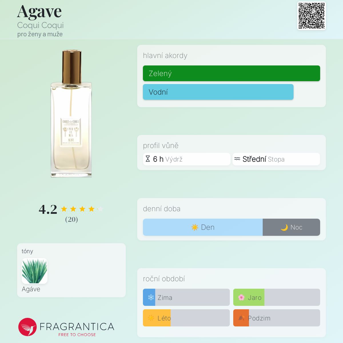 Agave podle Coqui Coqui je vůně pro ženy a muže. Agave byl/a uveden/a v roce 2007. "Nosem" za touto vůní je Nicolas Malleville.