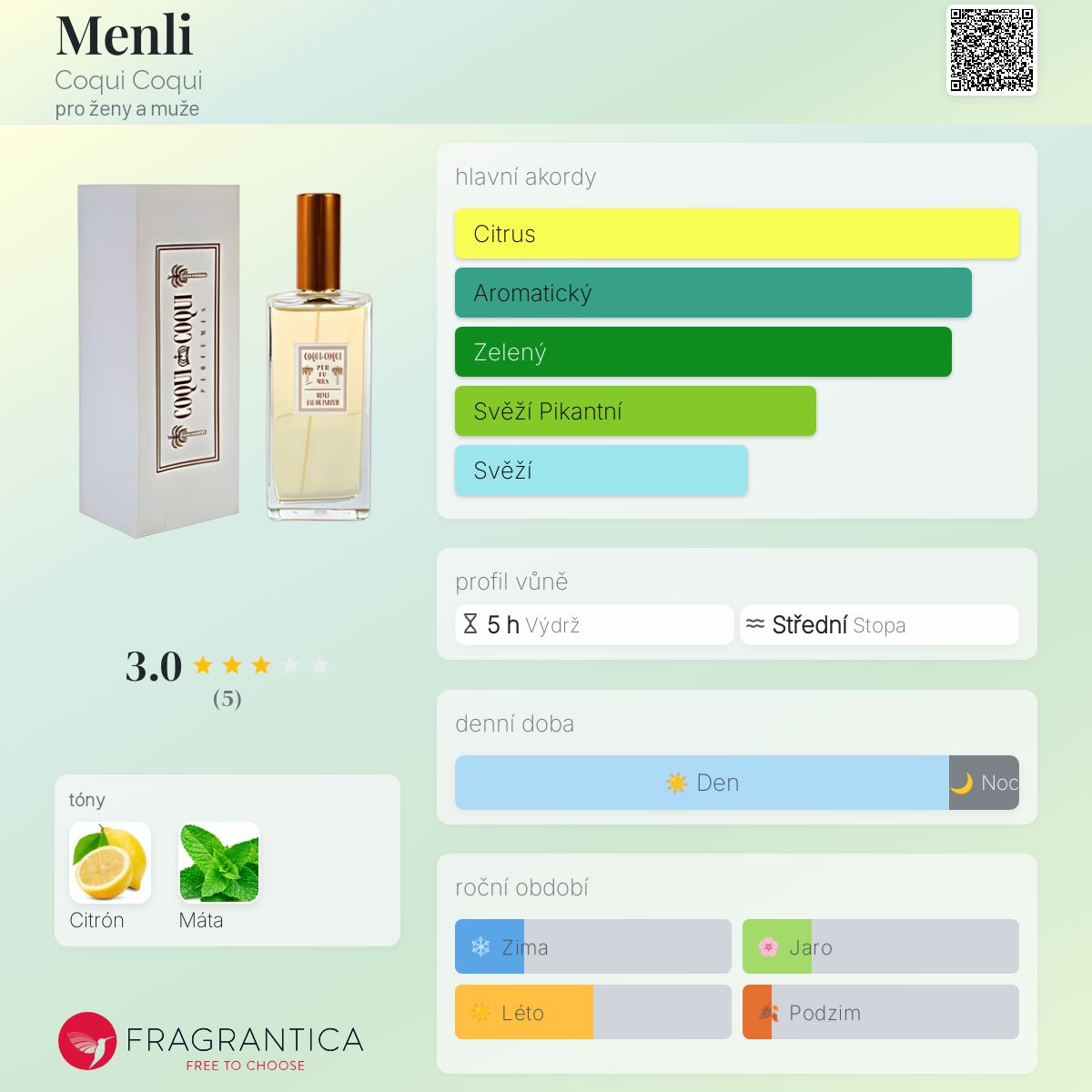 Menli podle Coqui Coqui je Aromatic vůně pro ženy a muže. Menli byl/a uveden/a v roce 2012. "Nosem" za touto vůní je Nicolas Malleville.