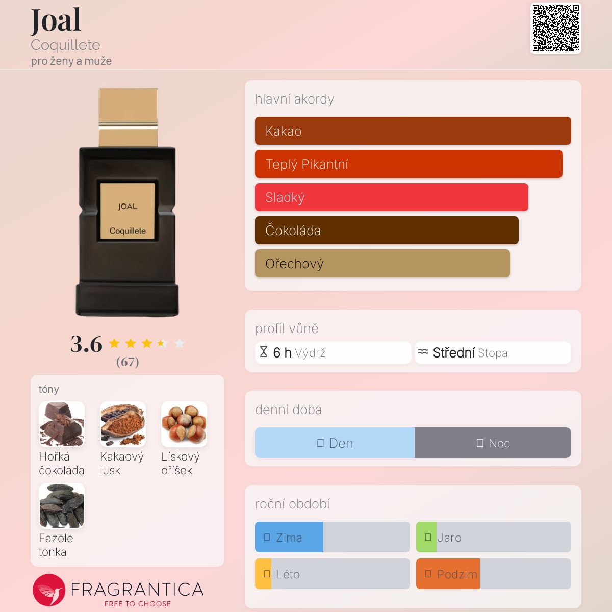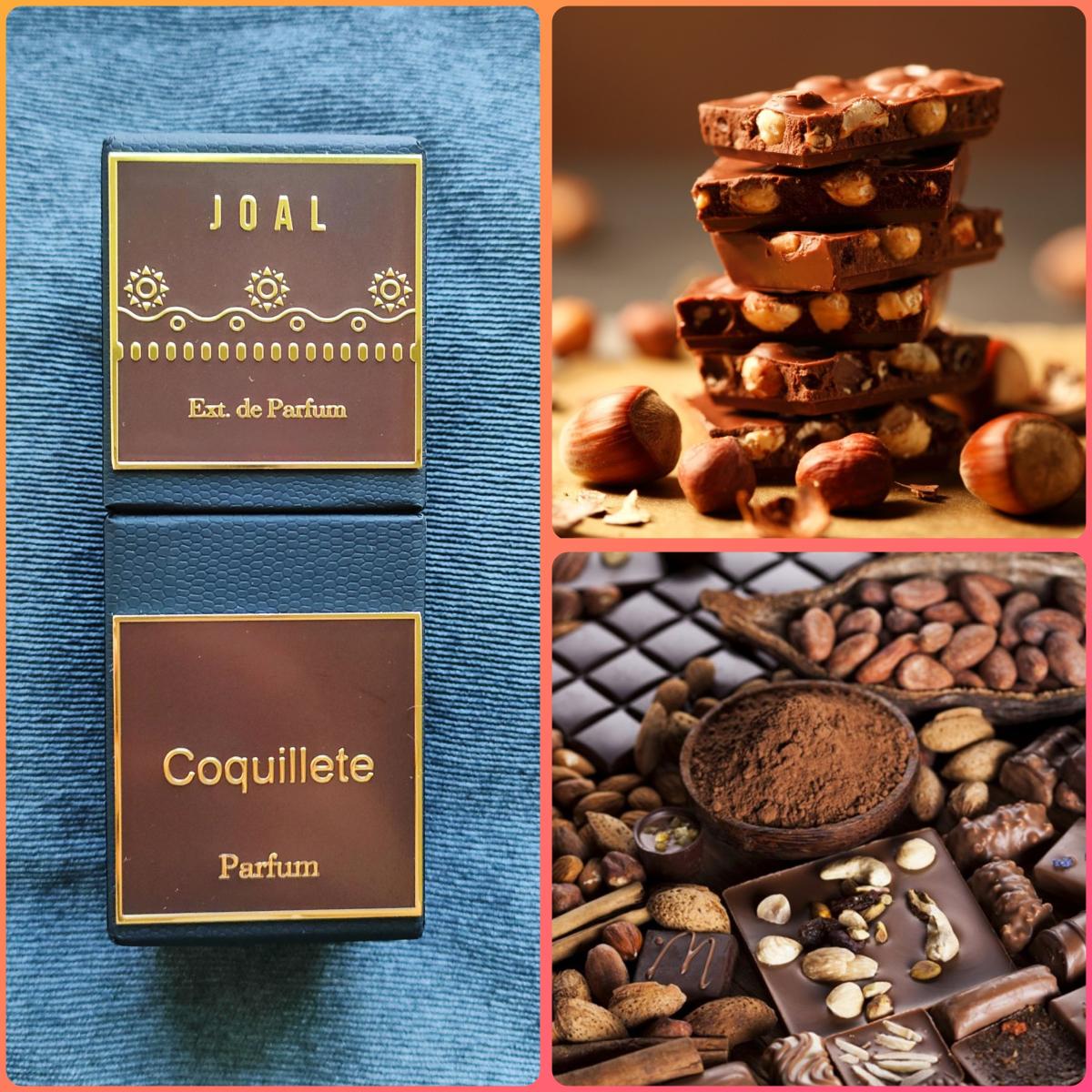 Joal podle Coquillete je Orientální Vanilla vůně pro ženy a muže. Joal byl/a uveden/a v roce 2022. "Nosem" za touto vůní je Rosa Vaia. Vrchní tón je Kakao ; střední tóny jsouHořká čokoláda a Lískový oříšek ; základní tóny jsou Lískový oříšek a Fazole tonka.
